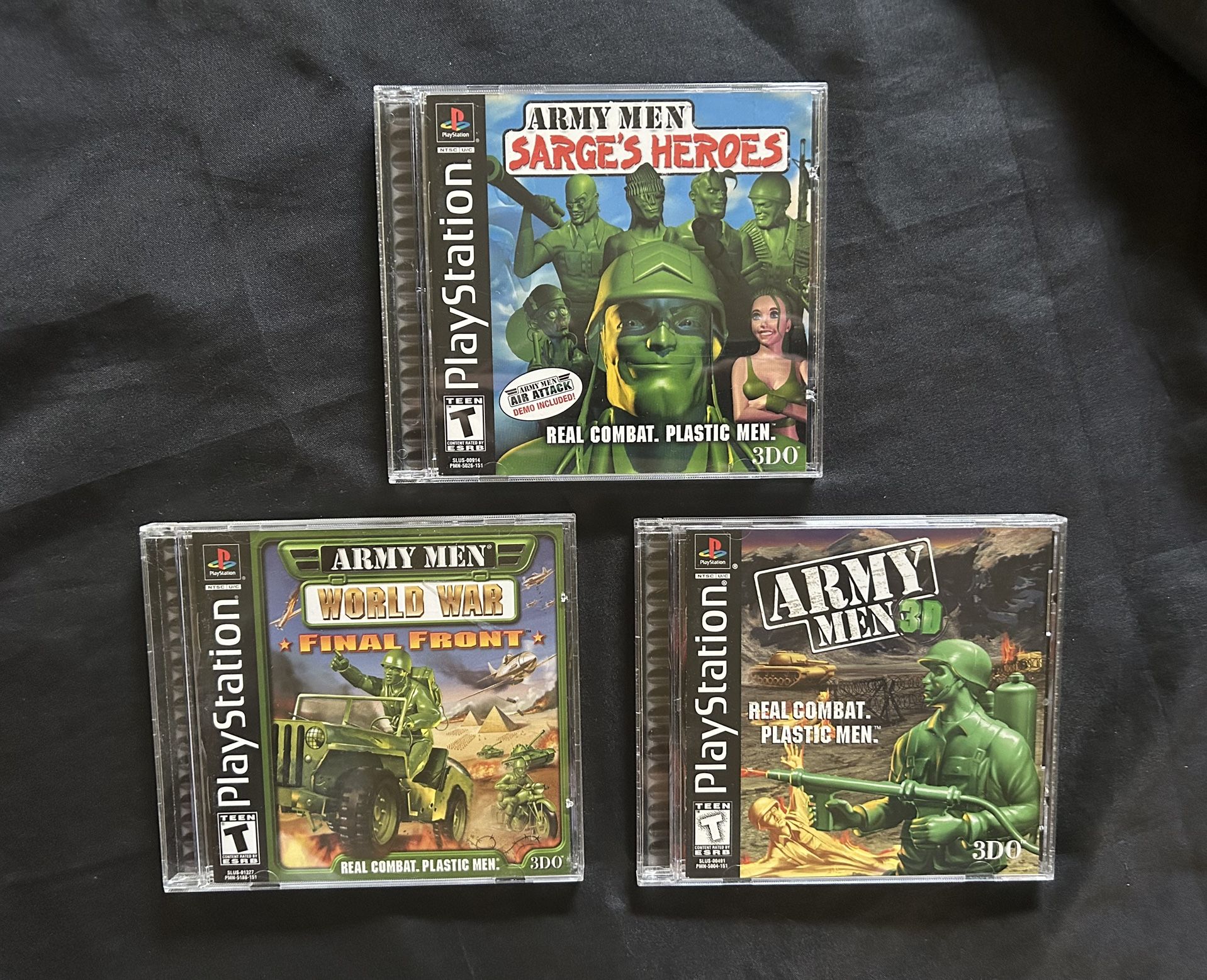 For sale is 3 vintage PlayStation 1 games of”Army Men”. All 3 are complete with manuals and clean discs. Add these fun games to your retro gaming collection for only $30Cash. Army Men 3D Army Men World War, Final Front Army Men Sarge’s Heroes $30 Cash takes all 3 Located in Kyle, Texas (About 2 miles off the highway) *be sure to browse my other listings. ---MAY CONSIDER TRADING MY ITEMS FOR THE FOLLOWING ITEMS: -Lone Star Beer Items, -Navajo/Native Jewelry -Sterling Silver (jewelry, rounds, silverware, scrap) -Guitars, Amps, Pedals -Signed artwork -Fenton, art glass/ Murano -Mid century swung vases, Viking LE Smith -Uranium/Vaseline glass -Concert posters and lithographs -MCM/ atomic age furniture pieces -Militaria pieces, Mancave items -Antique radiators, jeep/tractor grills -VTG Signage & advertising pieces -Cassettes, Vinyl records -Magnalite, Griswold, Finex, Smithey, Le Creuset, Cutco items -Herman Miller, Eames -BMX bikes -Zippo's -Belt Buckles -Oddities, obscurities -Tools -Blacksmithing, metal working tools