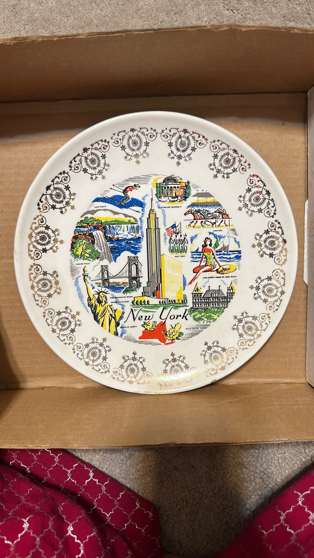This is a vintage New York souvenir plate featuring various landmarks. It is a decorative plate, likely made in the 1950s, possibly by potteries like Homer Laughlin or Salem China Co. The plate depicts iconic New York landmarks such as the Statue of Liberty, Empire State Building, and Brooklyn Bridge, among others. Similar vintage souvenir plates can be found for sale on platforms like Etsy and eBay. It is a collectible item and makes for a unique decorative piece or a gift for New York enthusiasts.