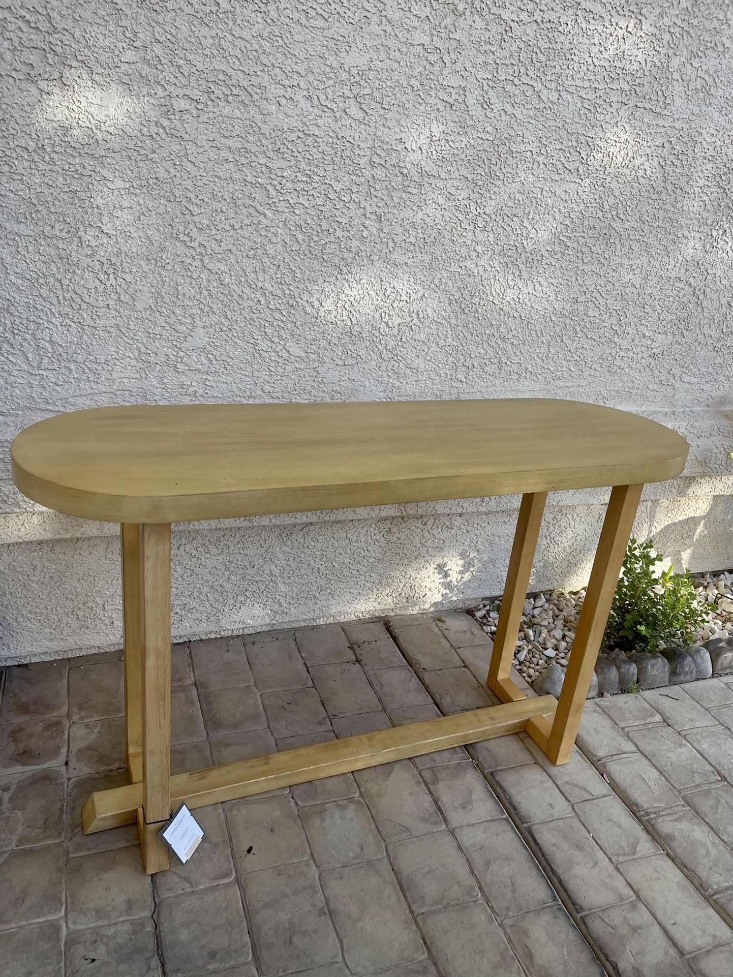 Brand new Only $125 Retail $200 plus tax Wood console table in a natural shade Oval design creates standout appeal Easily fits in front of sofa Offers easy integration with a variety of decor styles Dimensions (Overall): 30 Inches (H) x 50 Inches (W) x 16 Inches (D) Weight: 34.1 Pounds Holds up to: 250 Pounds Material: Rubberwood (Frame) Tabletop Material: Wood Veneer, Rubberwood, MDF (Medium-Density Fiberboard) Assembly Details: No Assembly Required Tabletop Thickness: 1.57 Inches Care & Cleaning: Spot or Wipe Clean