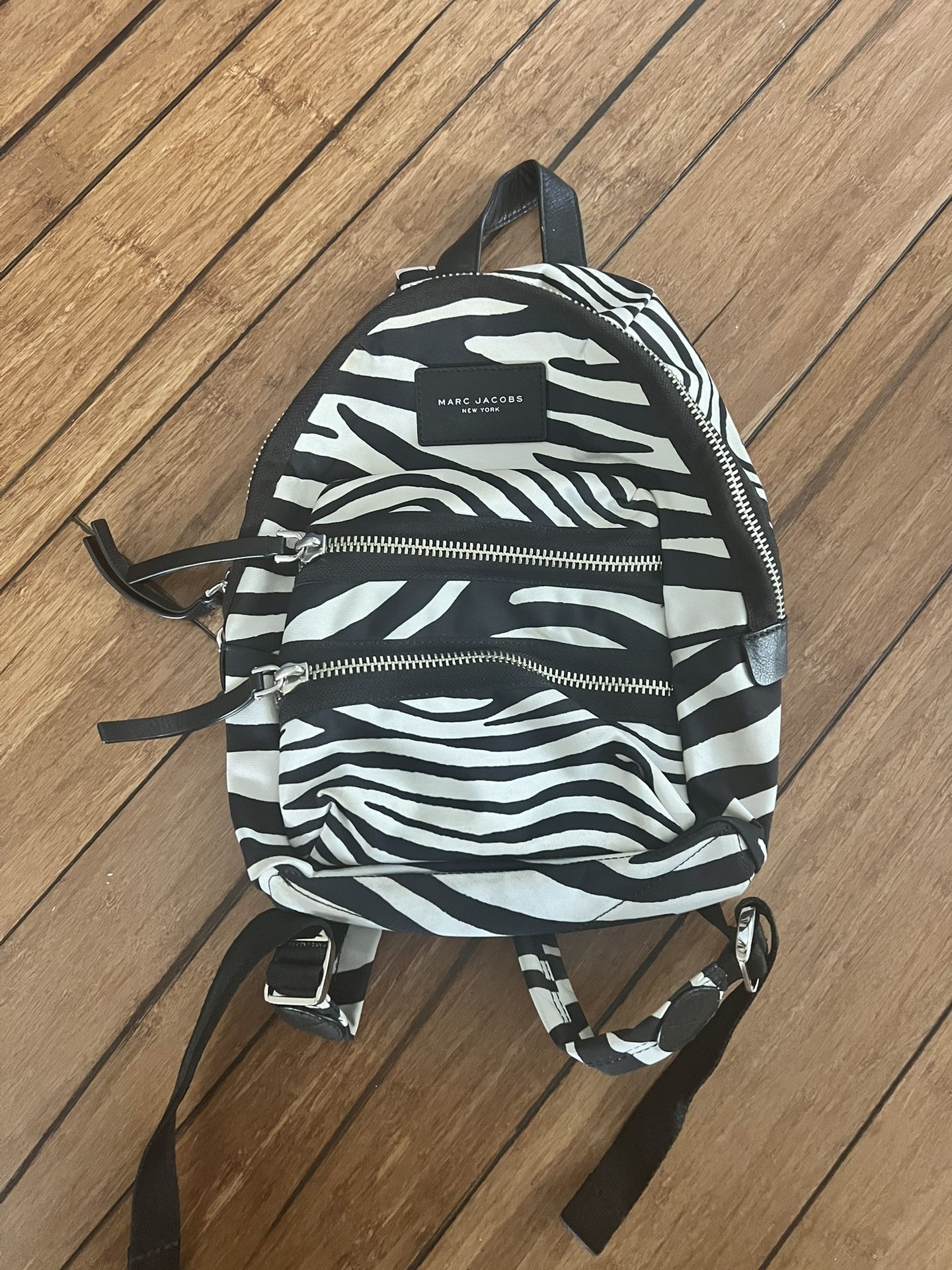 Black and white Marc Jacobs backpack, really cute with comfortable straps can hold a lot inside the main compartment and has two front zip pockets. Great size for day to day use and work/school. See less