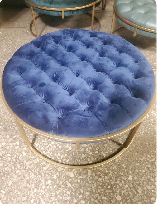Gold Finish Velvet Button Tufted Round Ottoman as your centerpiece. This glamorous ottoman can be used as a coffee table or as a footstool. The cushion is upholstered in plush fabric blue or green or light green faux leather and features beautiful button-tufting. A sturdy metal construction ensures durability and support through daily use and comes in a gold finish that complements any luxurious setting.Overall dimensions: 38 in. diameter x 18 in