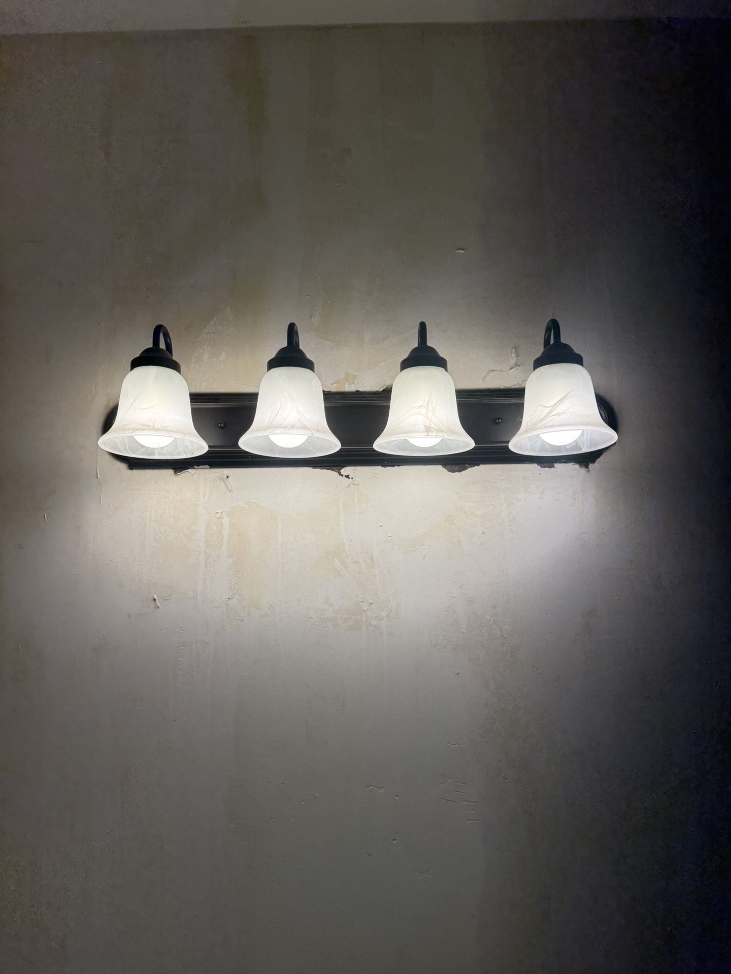 Four light fixture with alabaster glass shades. Dark brown/bronze finish