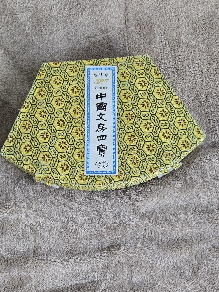 4 brushes, brush holder, ink stone and stick, water bowl, seal, and little bowl. Bowls and holder (white and blue porcelain)