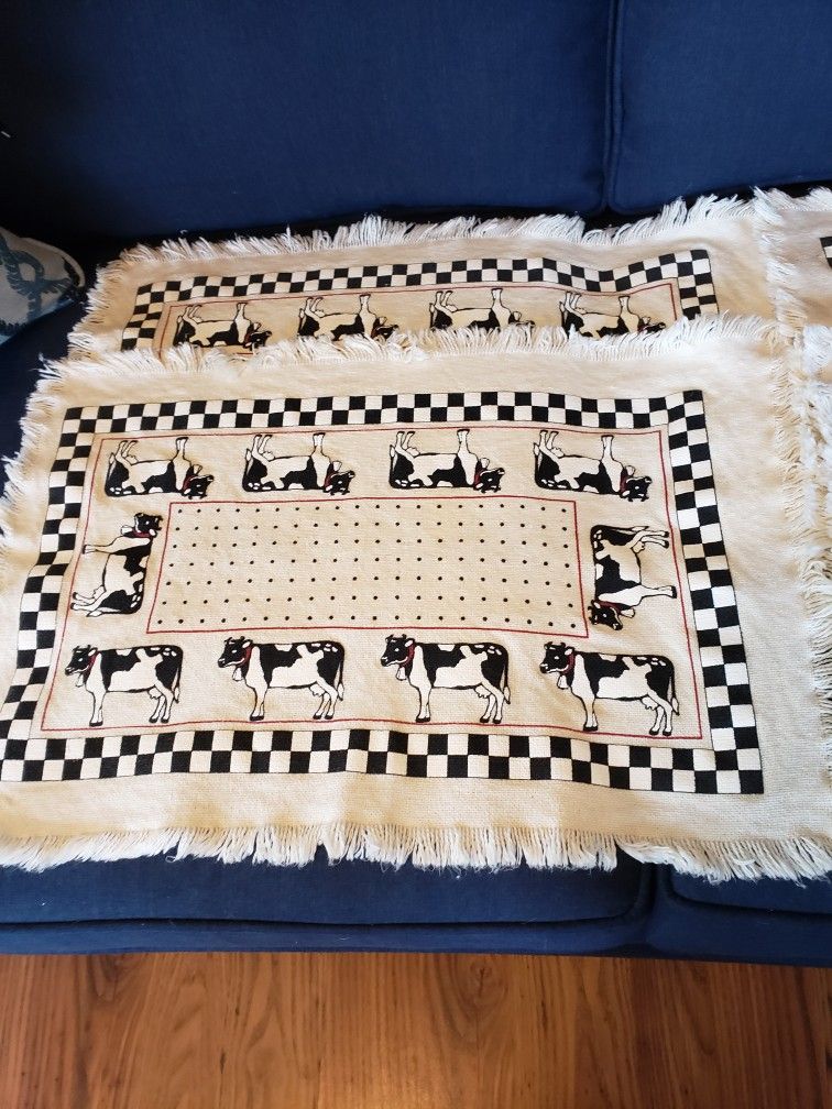 Set of 4. Handpainted cotton black and white cow placemats 22x15in. Plus a black and white cow dresser scarf 23x34in. New, never used.