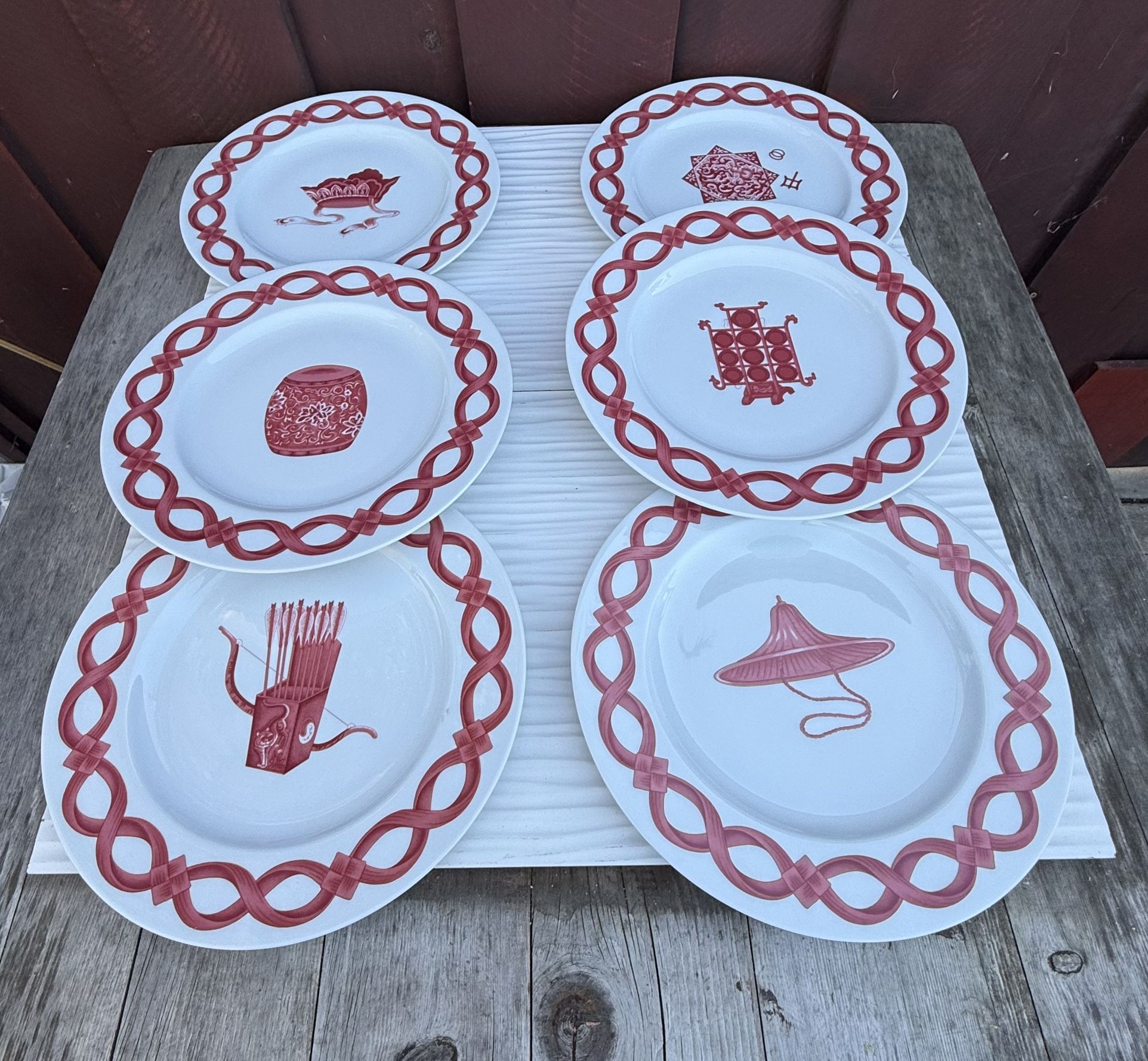 Set of 6 Asian Inspired Patrick Frey Dinner Plates 10.5"D Nicobar Red