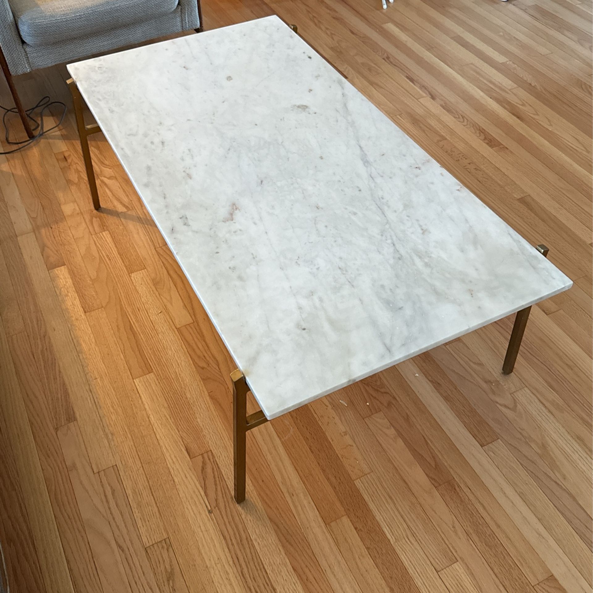 Real marble coffee table from Cb2. Brass legs. Normal wear see photos Overall Dimensions: Width: 52 inches, Height: 17 inches, Depth: 26 inches Original price was $900