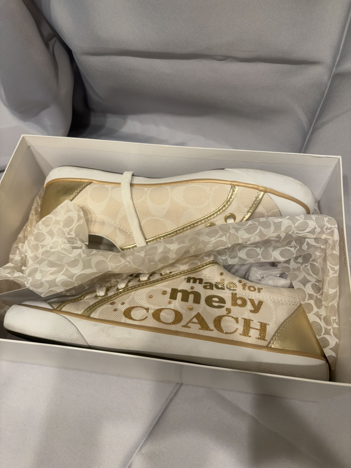 Elegant Coach sneakers with a stylish gold and cream design. Perfect for casual wear.