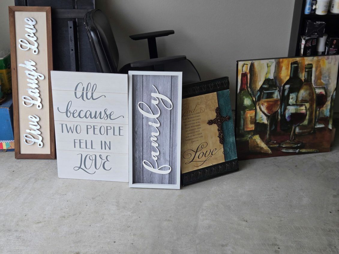 I'm Selling there Wall Art, Canvas , in pristine condition, Selling individually or all together ! Canvas $25 Religious Metal Frame, Wall Art $30 Family wooden wall art $30 All Because...Wooden Wall Art $35 Live, Laugh, Love wooden wall art $30 Estoy vendiendo estos Cuadros decorativos Wall Art, Canvas, estan como nuevos Los vendo individualmente o todos juntos! Canvas de botellas $25 Marco de Metal Cuadro Religioso $30 Arte de pared de madera " FAMILY $30 All Because...cuadro de Madera $35 Live, Laugh, Love...Cuadro de madera $30