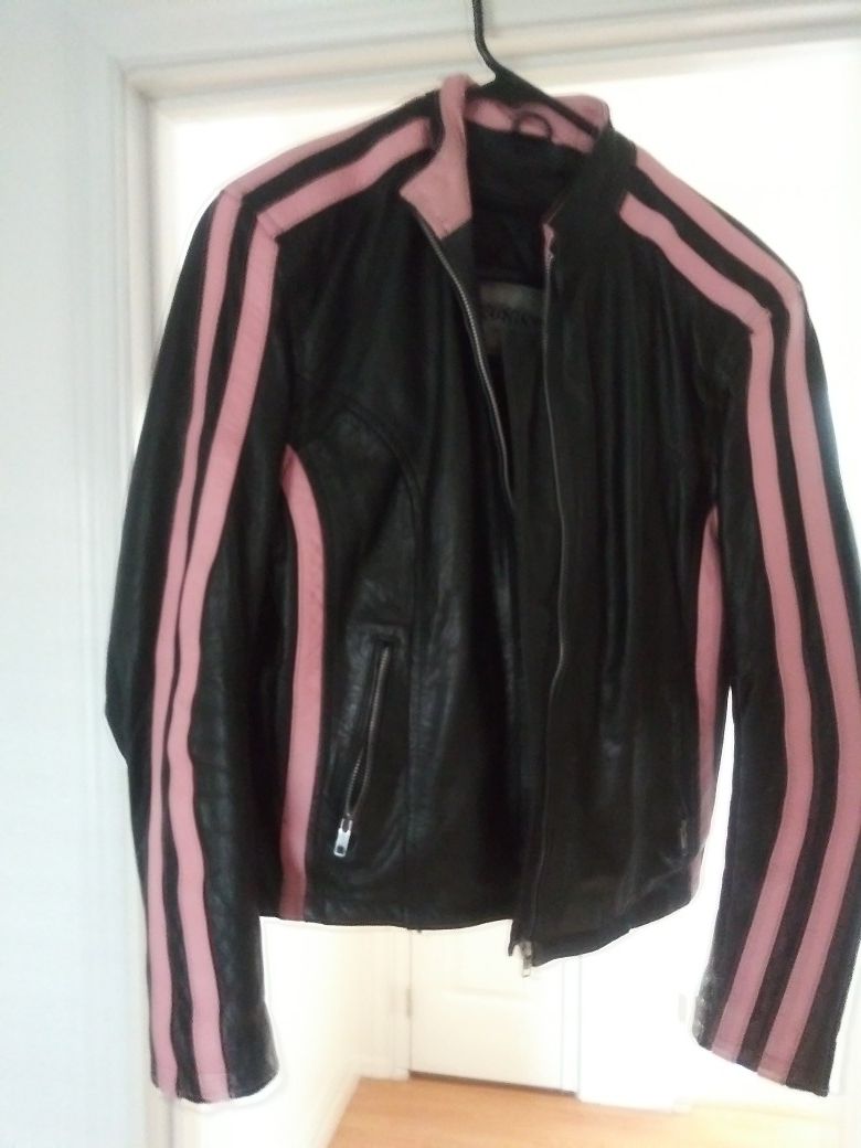 Womans size large black with pink leather jacket. In new condition. Fits more like a medium I think. Broadway/Ellsworth area