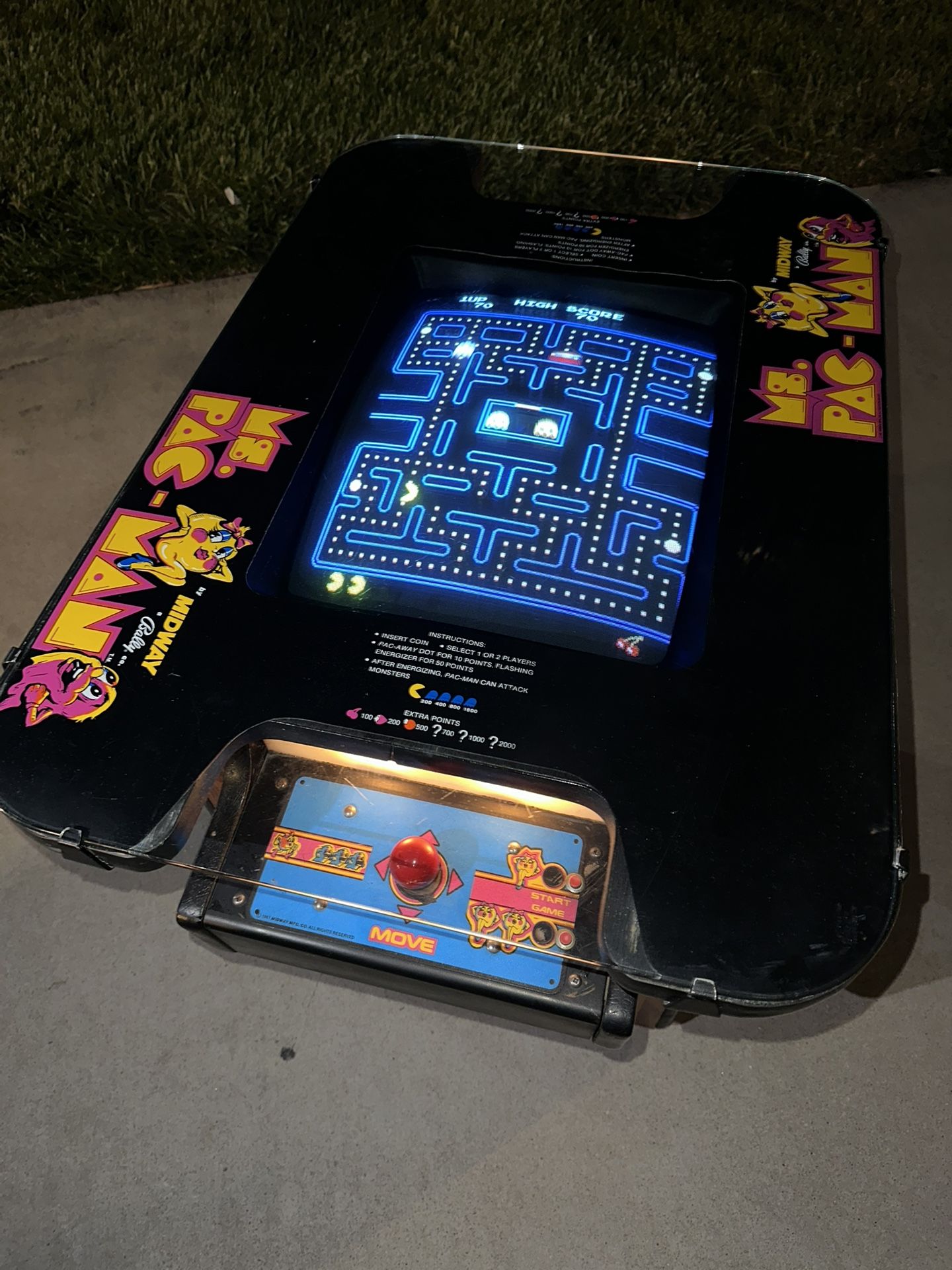 Vintage 1981 Ms. Pac-Man Tabletop Coin Arcade by Midway Bally – Original Cabinet – Fully Functional Up for sale is a genuine 1981 Ms. Pac-Man cocktail-style tabletop arcade machine by Midway Bally Co. This is a true original, featuring the authentic wood cabinet, original glass top, and factory artwork. A rare collector’s item that still functions flawlessly today! Condition & Details: • Fully working – recently professionally serviced by a licensed arcade company • All original U.S.-made components – no modifications or modern replacements • Accepts quarters – coin price can be increased or adjusted by the owner • Original cabinet from 1981, showing expected vintage wear and tear: • Scratches on the glass top (can be polished if desired) • Scuffs and marks on the exterior and edges from regular use • Base panel shows significant wear – some areas of the wood may need reinforcement or replacement depending on your needs Perfect For: • Restaurants, arcades, Airbnbs, malls, or any vintage-themed space • Collectors looking for a fully functioning, unmodified original arcade machine • Great conversation piece and entertainment upgrade for any room Pickup & Shipping Info: • Local pickup only (Victorville, CA area) • I’m happy to assist with shipping if you’d like to arrange your own freight or courier Own a piece of arcade history with character and charm! This Ms. Pac-Man unit is still going strong and ready to continue making memories. Feel free to message me with any questions or for help coordinating pickup or delivery options.