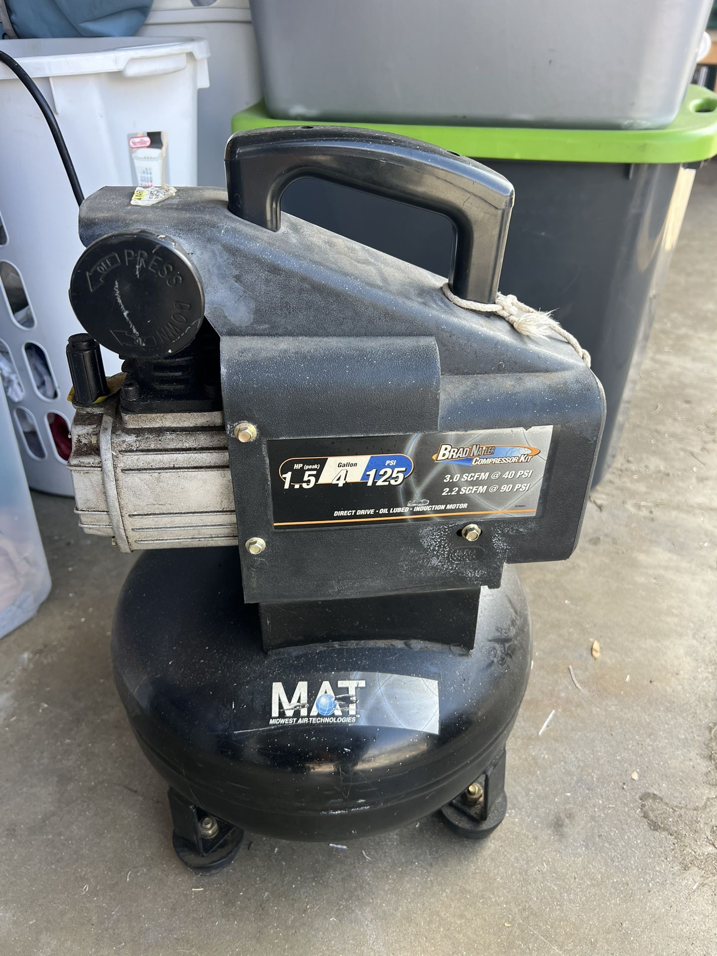 Used air compressor 4 gallon 125 psi Works in okay condition Needs to be cleaned that’s it Pick up only