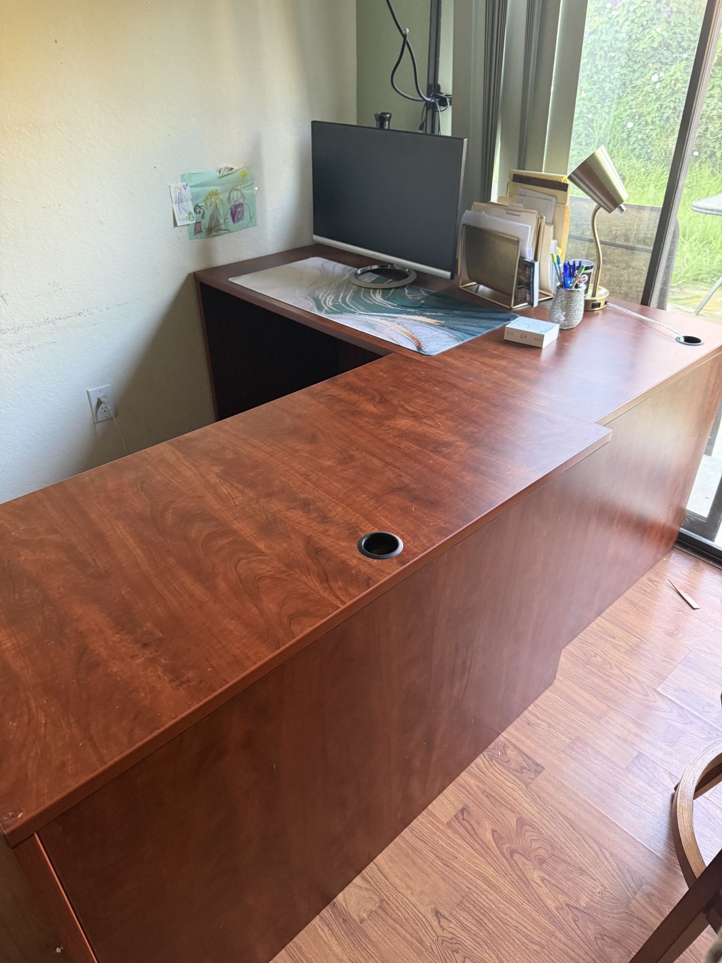 Has a right return and two storage cabinets including two file cabinet drawers and four other drawers. Both on wheels. Beautiful cherry wood color. It’s a solid desk. Moving and have no more room for its must go this week. Hoping it can go to a new home!