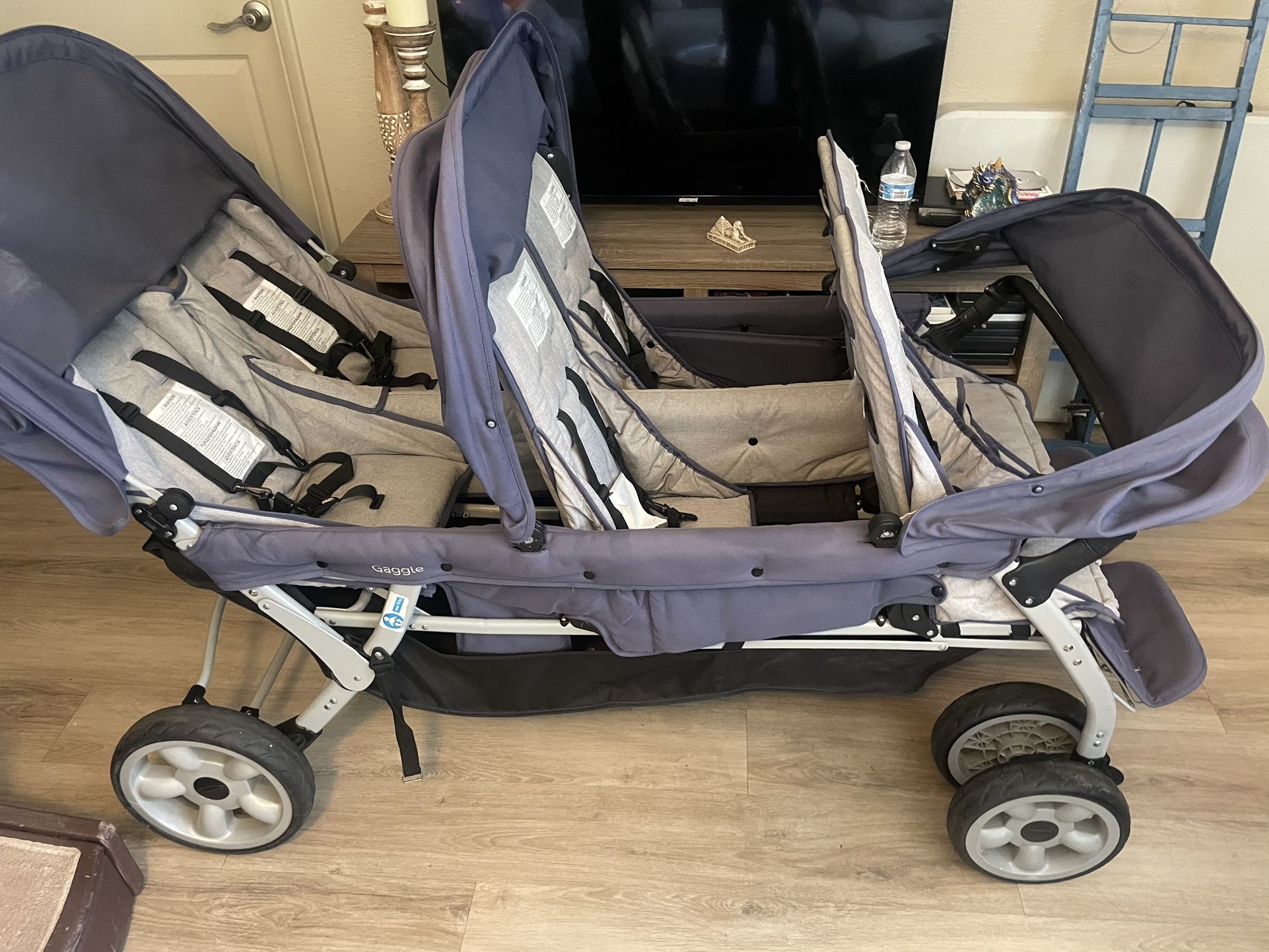 I HAVE A LIKE NEW GAGGLE 6 SEATS FOR SEXTUPLETS OR GREAT FOR DAYCARE SEATS 6 INFANTS AND TODDLERS,ALL SEATS CAN LAY DOWN OR SIT UP EXTRA STORAGE COMPARTMENTS AND DRINK HOLDERS,WHEELS AND SEATS LIKE NEW FIRST 250$TAKES IT WITH TAX COST ME OVER 1200$