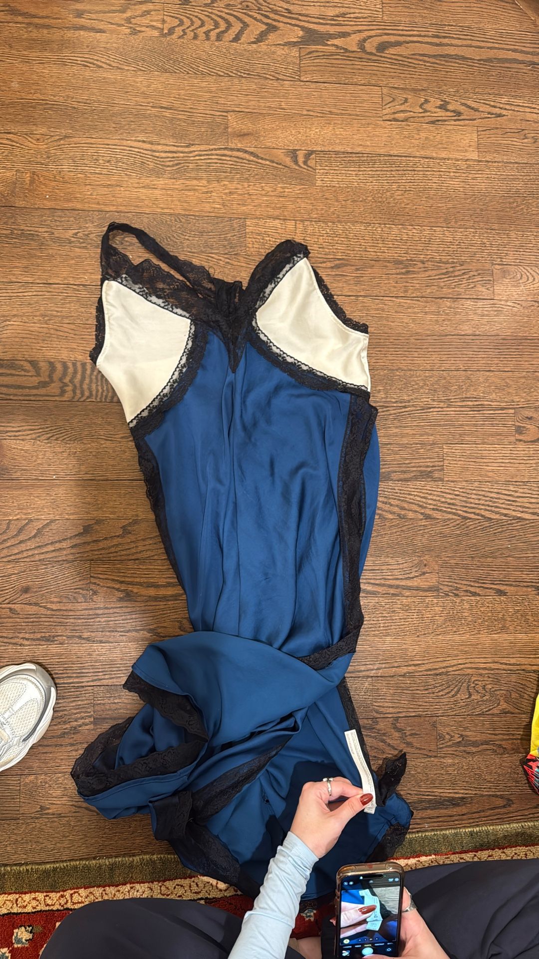 Great slip dress or nightgown with slits on the side lace in intertwined this dark blue with cream as a piece to have