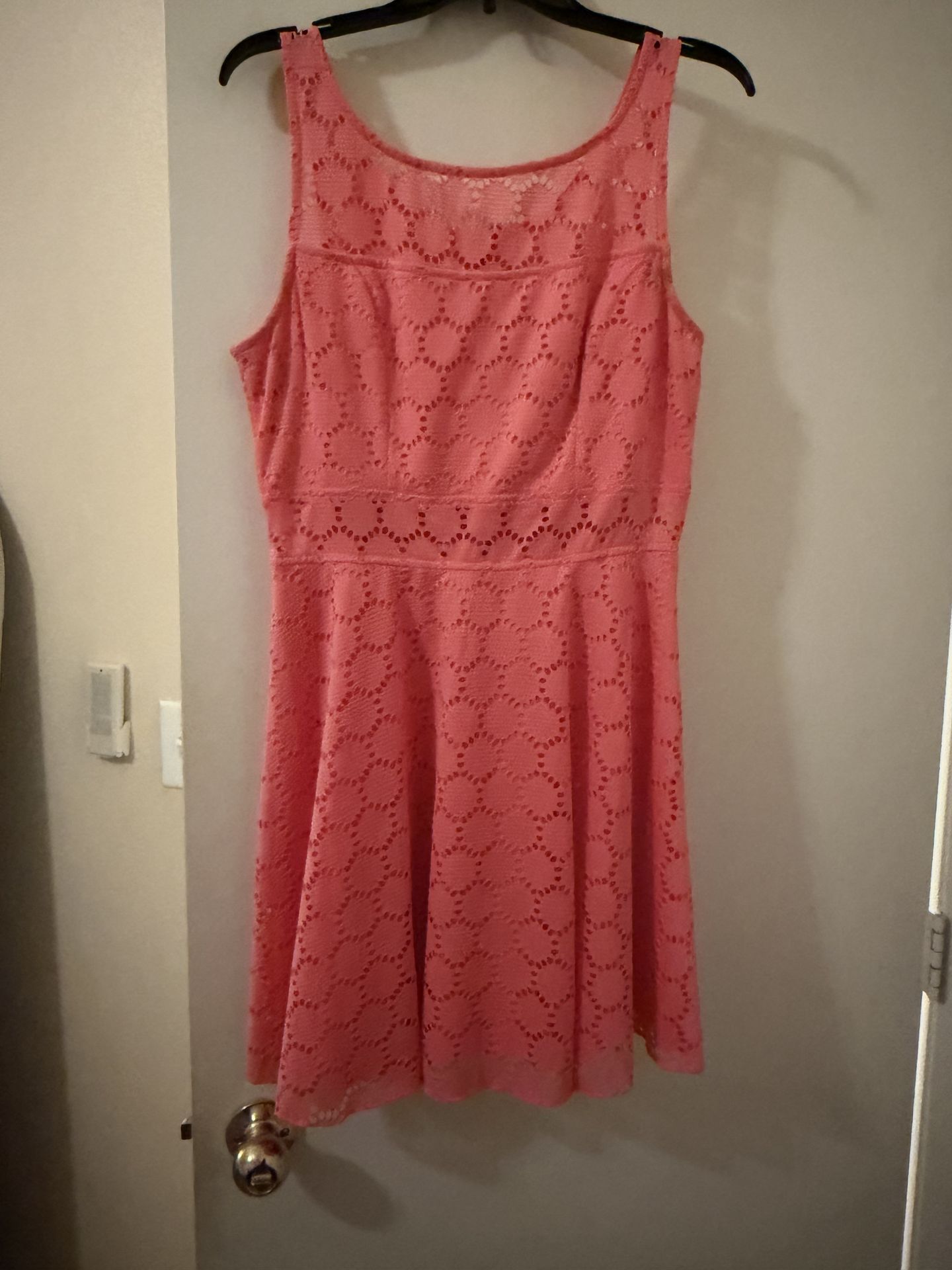 Chic coral lace mini dress by Trixxi. Features a sleeveless design and intricate lace pattern. Ideal for casual outings or special events.