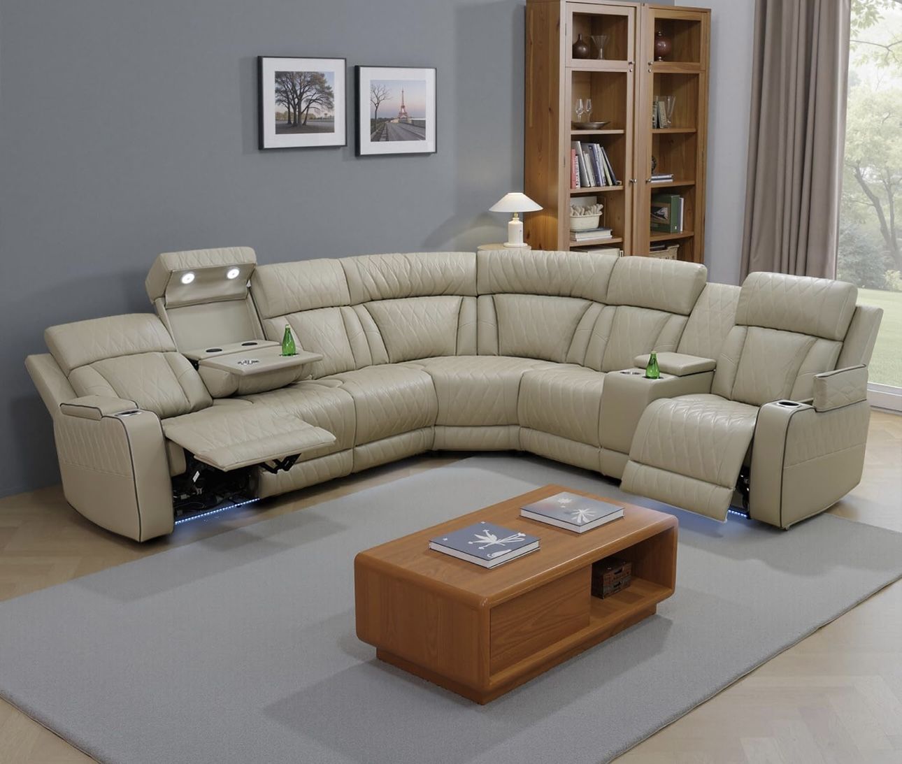 Power Electric Beige Cream Leather Fully Reclining Sectional Couch