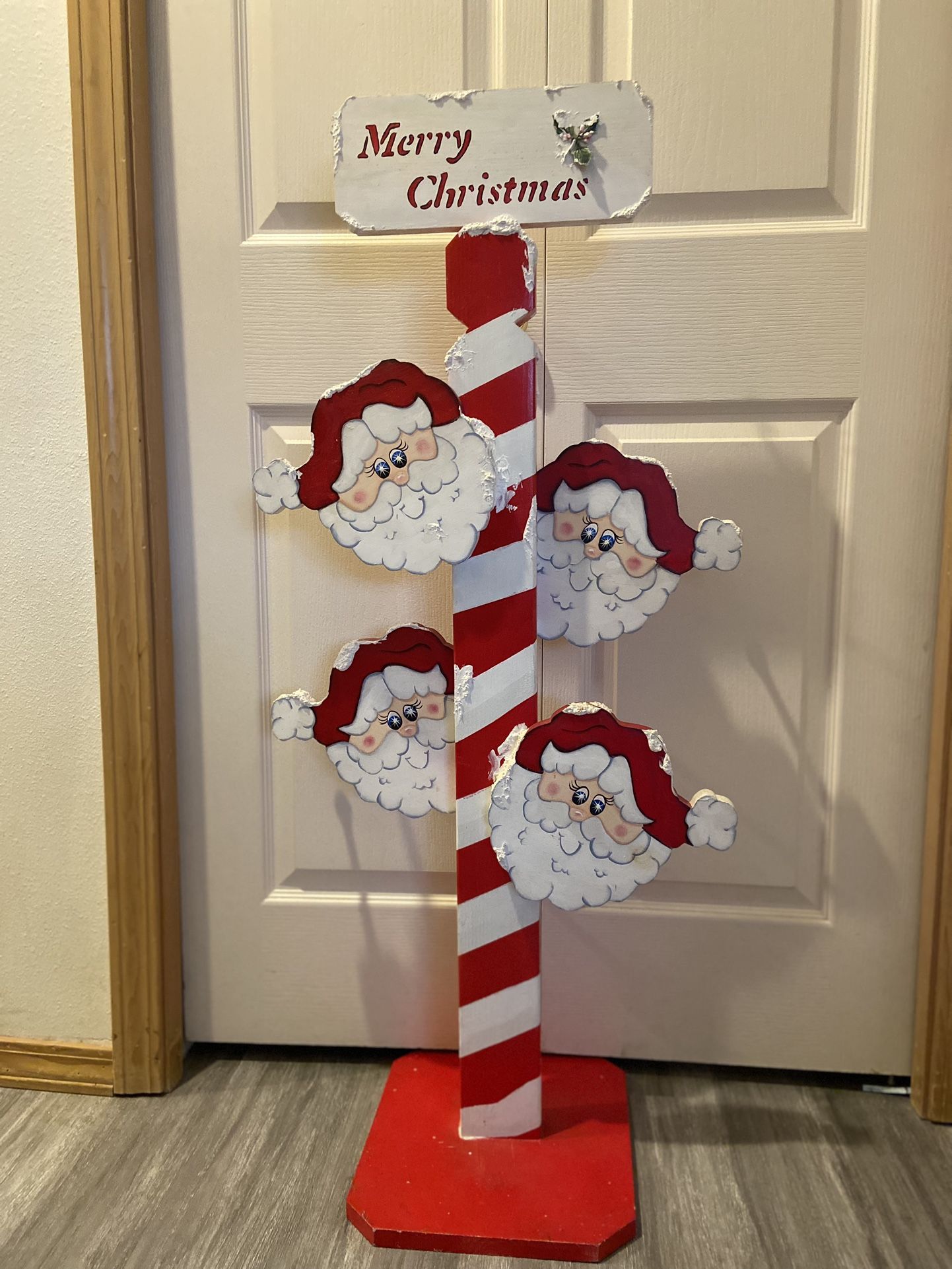 Wooden pole will hold up to 8 stocking for Santa to fill. It stands 44 inches tall and 22 inches at widest area. 4 Santa faces smile and are painted on both sides. Loved many years now needs new family. Or best offer