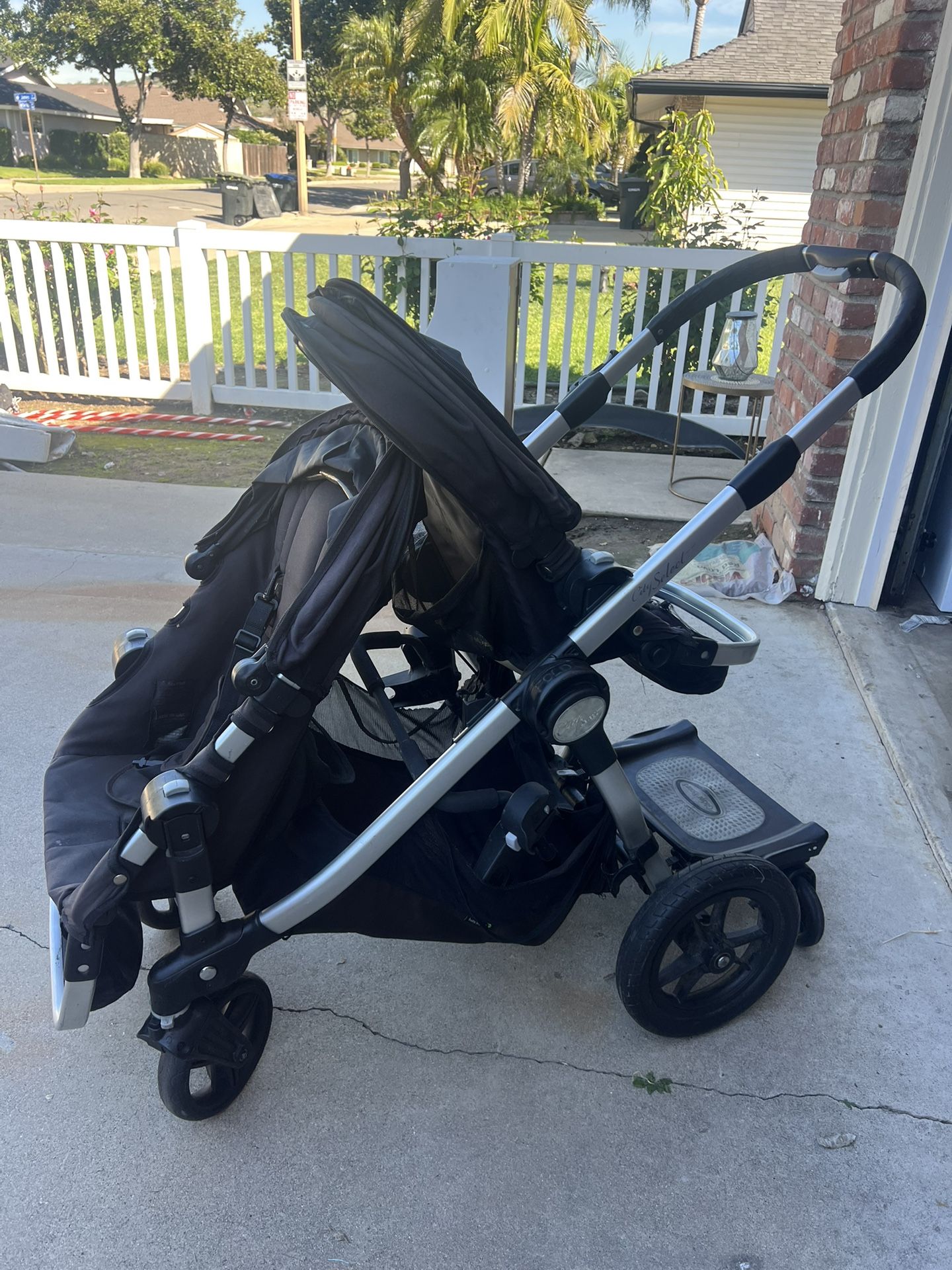 City select double stroller includes: Two toddler seats with sun shades Glider board Infant car seat attachment See photos for damage, one seat is ripped where the feet go, the bottom storage compartment also ripped, but both are replaceable. The glider board strap is broken, but it easily leans forward or ties to the frame. The frame and other attachments are still in good shape.