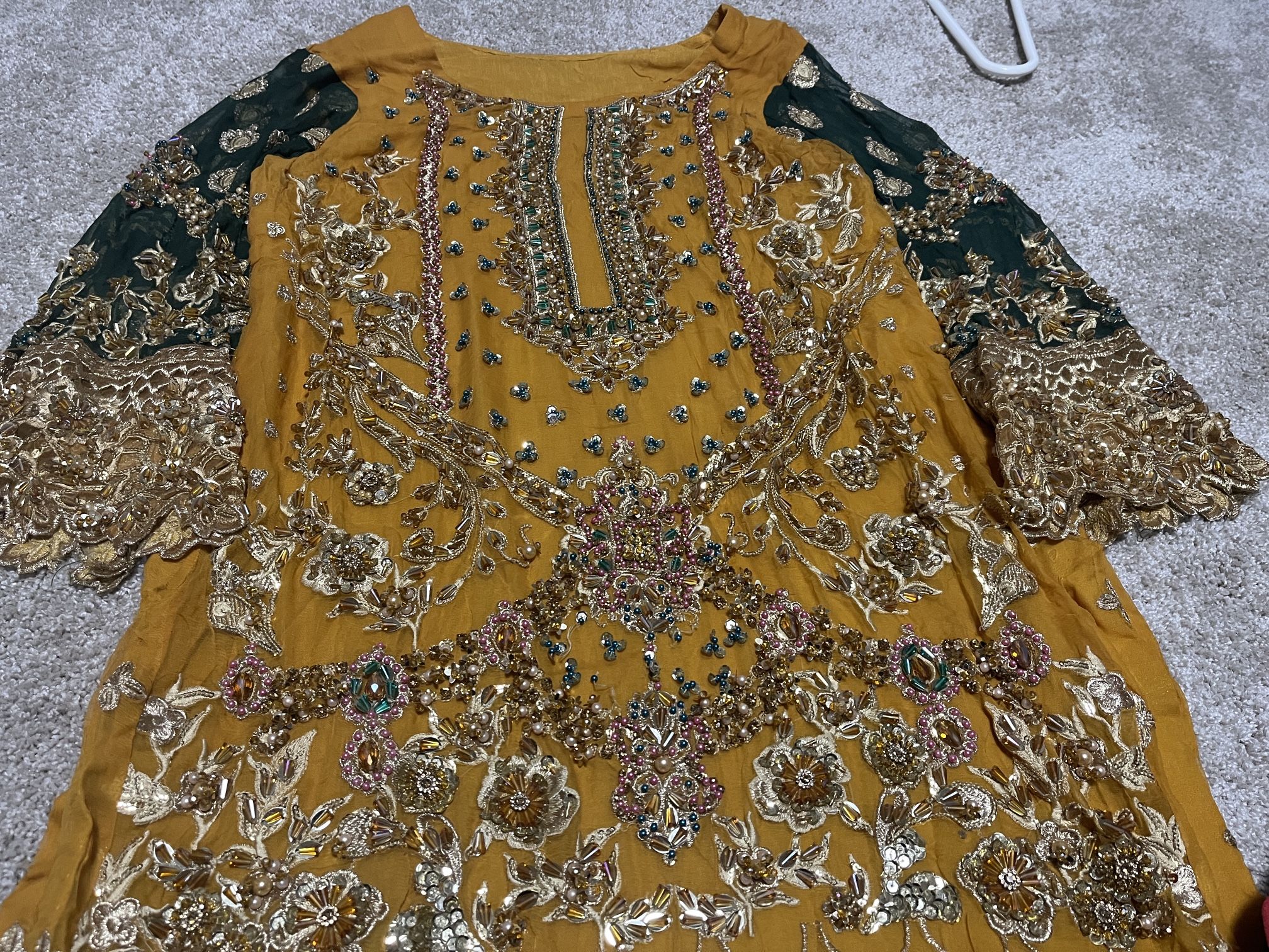 Beautiful mehndi outfit heavy Addawork Banarsi trouser and a beautiful and heavy lace detailing on it two tone mehndi colors dupatta brighten your mehndi event wore only mehndi event for a couple f hours