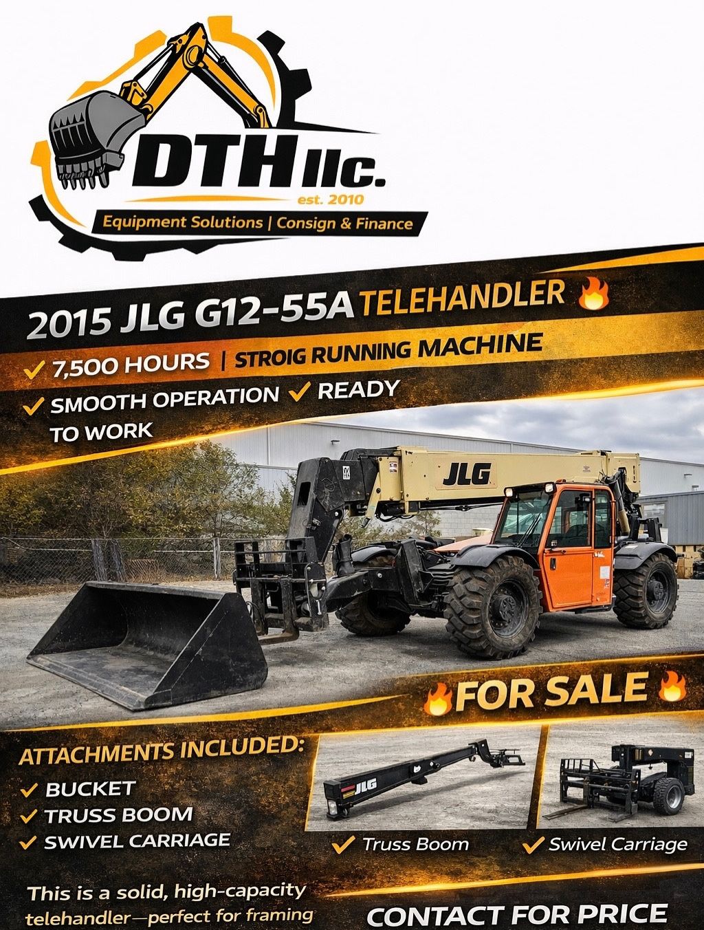 π² Message me for pricing & details! π₯ FOR SALE β 2015 JLG G12-55A π₯ Big reach. Big capacity. Ready to handle serious jobs πͺ βοΈ 7,500 Hours βοΈ Strong Running Machine βοΈ Smooth Operation βοΈ Jobsite Ready π§ Attachments Included: β’ Bucket β’ Truss Boom β’ Swivel Carriage Perfect for framing crews, material handling, and high-reach applications. This unit is built to perform and ready to go to work. π² Message me for pricing & details! #JLG #Telehandler #HeavyEquipment #EquipmentForSale #ConstructionLife #DieselPower #JobsiteReady #MaterialHandling #DTH