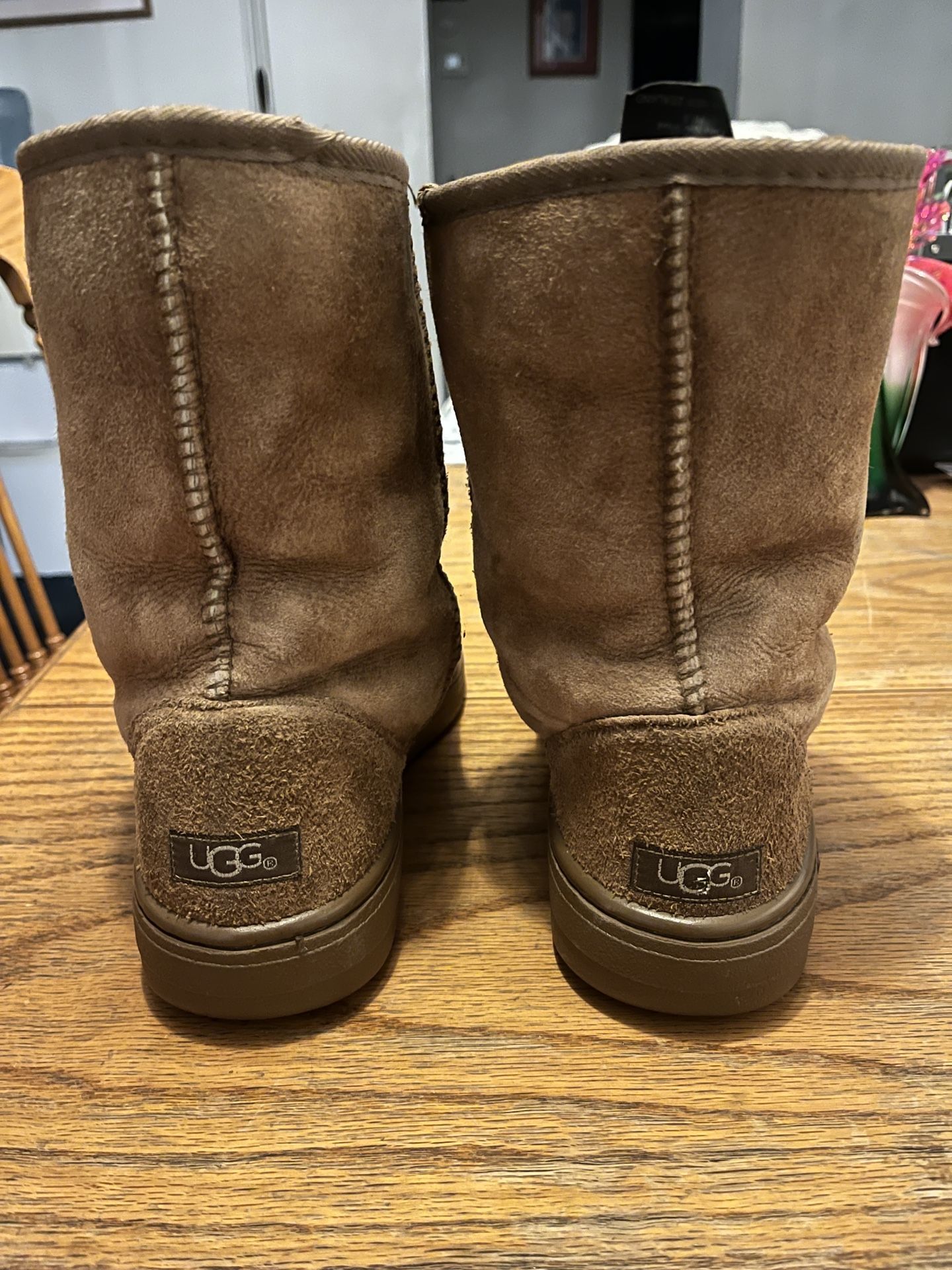 High desert newer Adelanto pick up- Ugg Brown Material Mid Thigh High Boots Mens L 9-10 or unisex style. Nice soft speckle brown made from New Zealand on tag newer type wool inside legs & feet for warmth. Hard rubber outer soles for weather proof to wear. Material in pretty good shape too, $50.