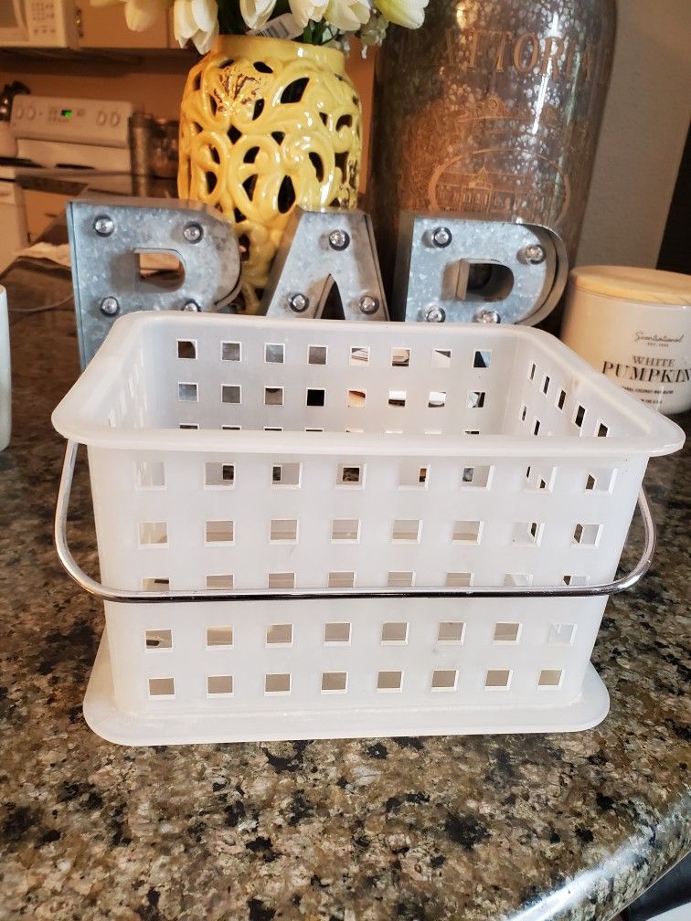 Small Plastic Organizer with Handle. Perfect for the bathroom or kitchen to organize supplies and bathroom essentials. Sanitized and cleaned. Made of hard plastic so it is sturdy. Measures 8 in long x 7 in wide x 4.75 in tall. Purchased for $10.