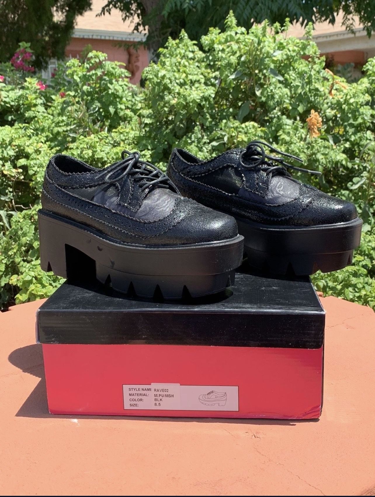 Brand New Metallic look, mesh inserts, adjustable laces, a slightly cushioned insole, an approximate 2.25 inch lug-sole platform for extra comfort. Sizes available in Black 8 9