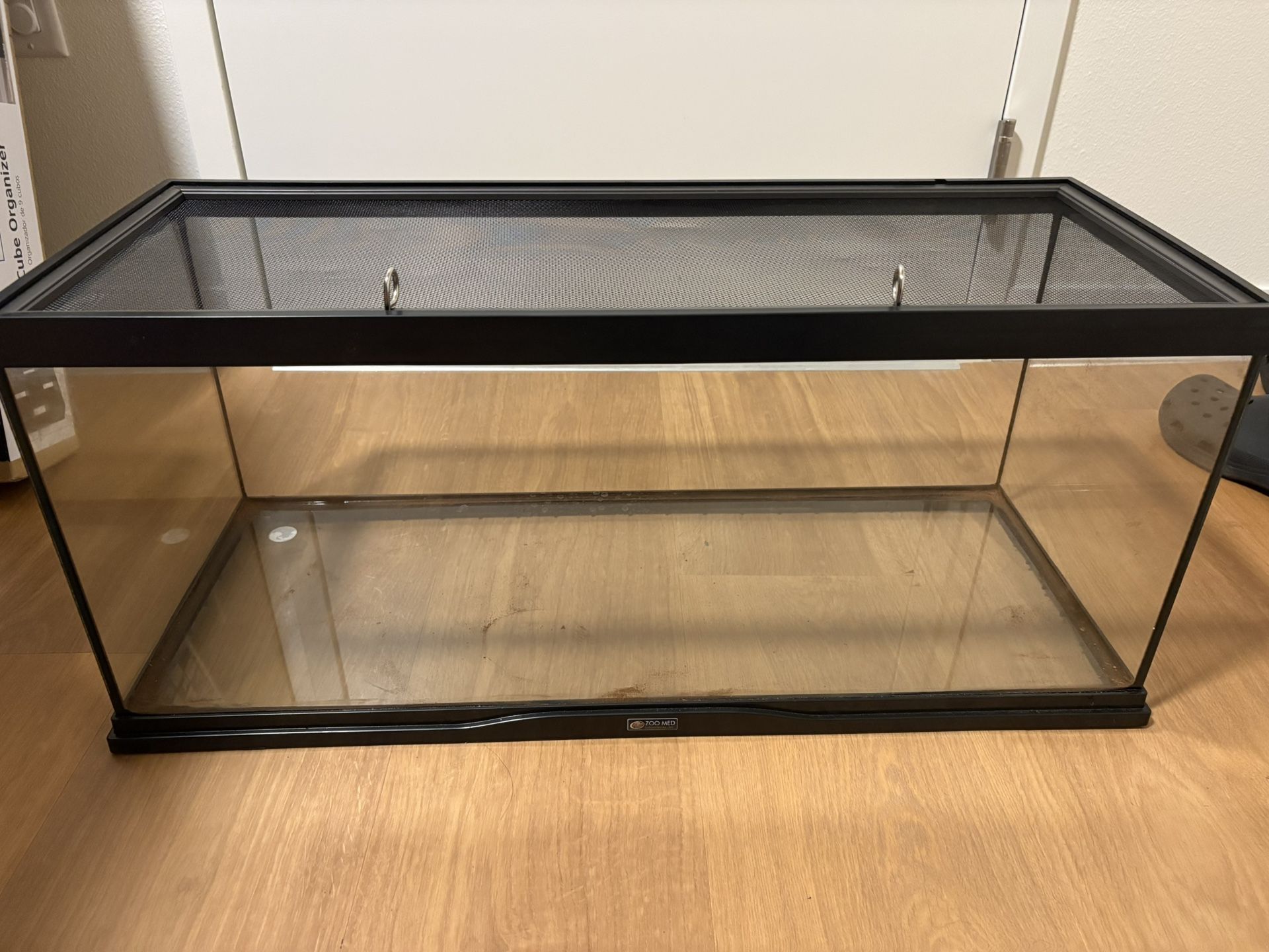 ZooMed brand. Used for less than a week before we changed the size we needed. In perfect condition has sliding lid with pin closure on top. Must pick up