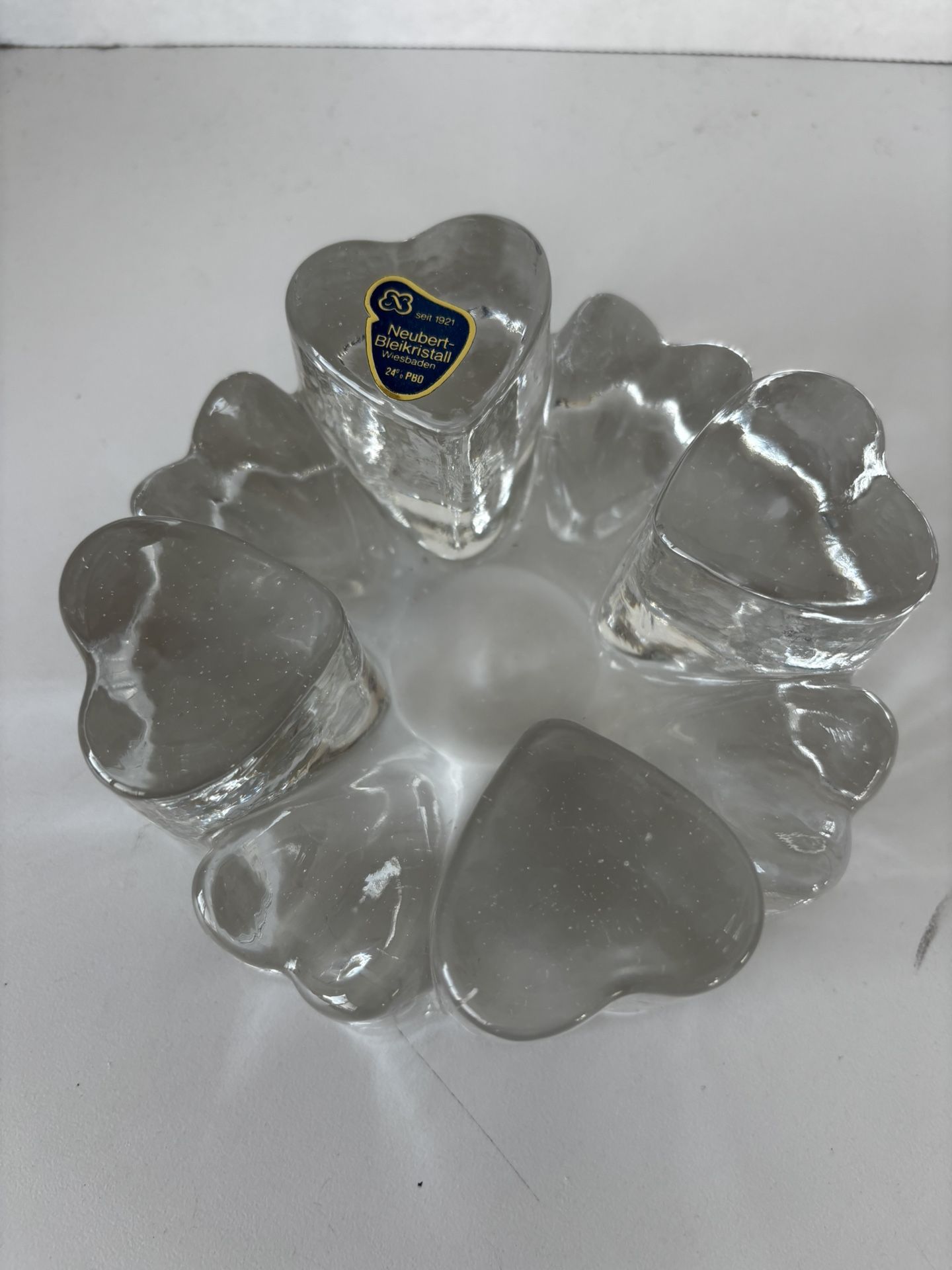 Beautiful crystal trivet. Could be used as a candle holder as well. I noticed there are little indents in the lower hearts similar to an ashtray. which it could be used as an ashtray as well! Its very heavy and beautiful. Measures 5”W and 2.5”T