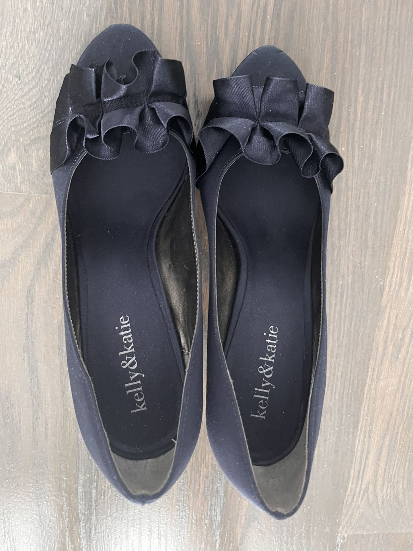 Navy Blue Fabric woman’s shoes. Size 7.5 . , With the Holidays around the corner it’s a perfect dress shoes. The bow on the top adds more beauty to this shoe. Mint condition.