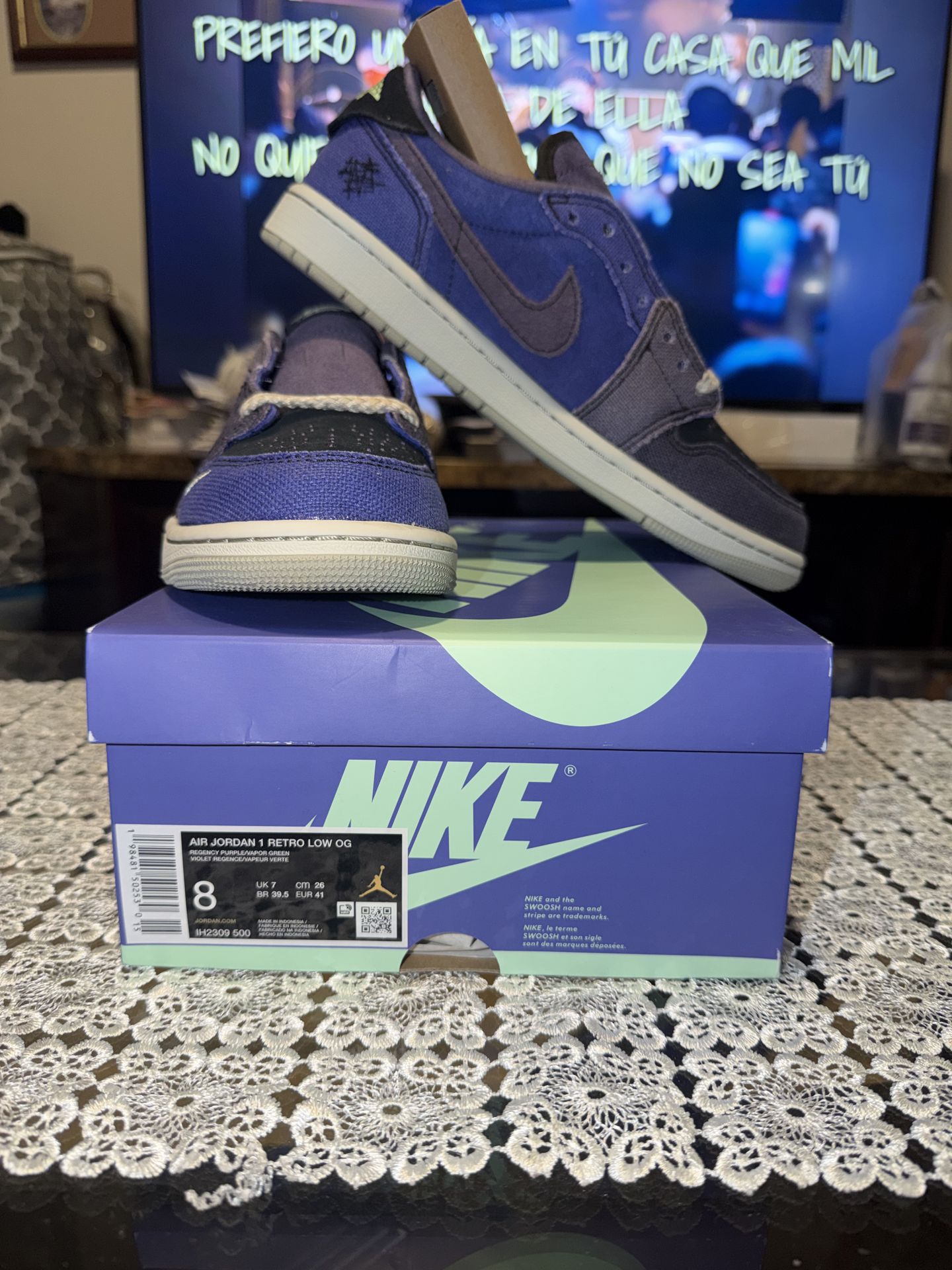 The Jordan Zion Williamson Air Jordan 1 Low Voodoo Alternate is a stylish sneaker with a low top design, featuring a unique color palette of Regency Purple, Vapor Green, Black, Dark Raisin, Daybreak, and Light Silver. This athletic shoe is part of the Air Jordan product line and is designed for men who appreciate both fashion and performance. The suede upper material provides durability and comfort, making it a desirable choice for those looking for a standout pair of sneakers. BRAND NEW W BOX, SMOKE FREE HOME. All offers are welcomed and encouraged. God bless and happy buying! If you have any questions, please feel free to reach out. I’ll answer within 12 hours.