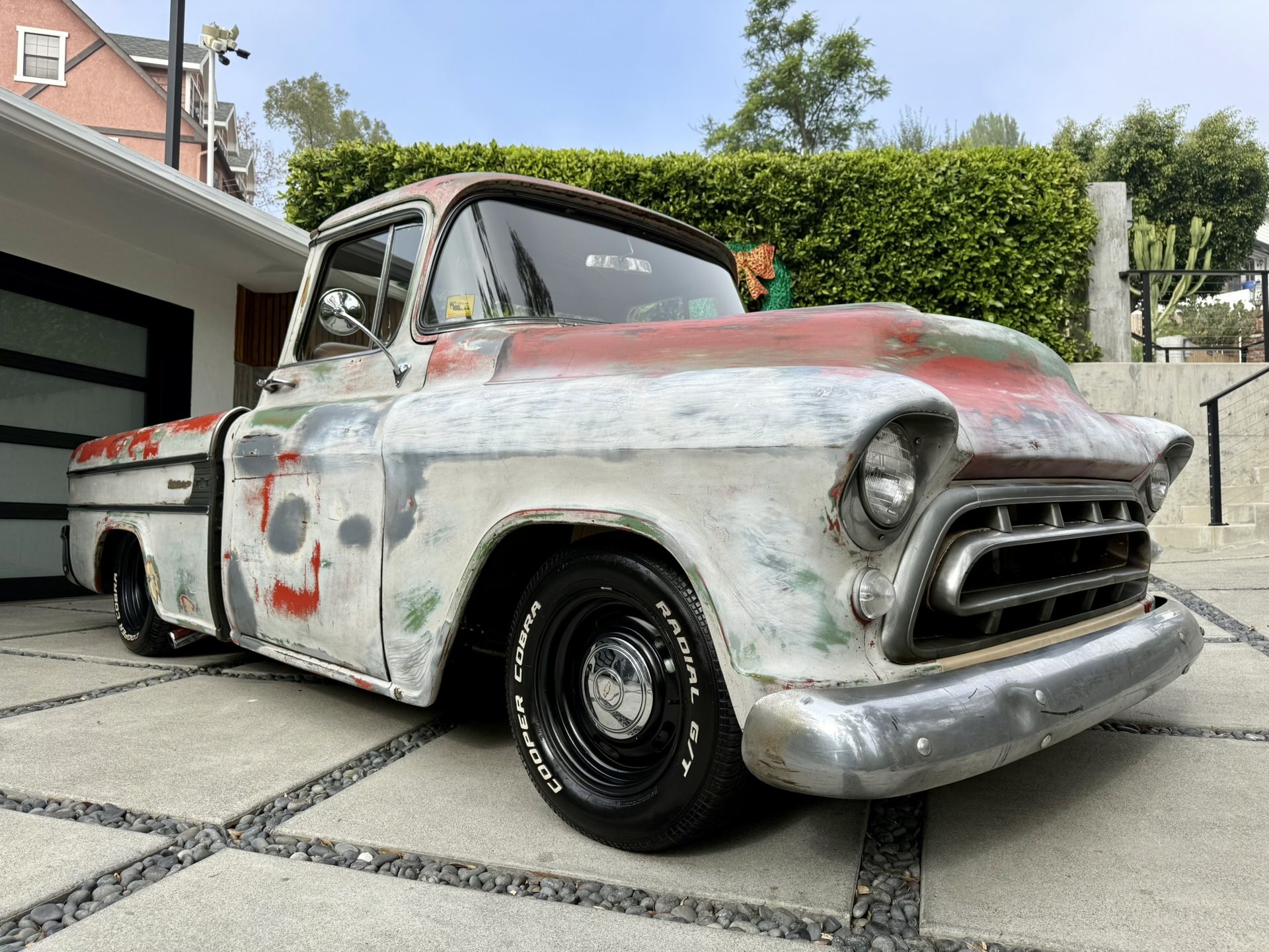 57 Chevy Cameo w/fiberglass short bed, with original patina, with a rebuilt 327 Camaro engine & 700R trans. All new mustang-2 front end suspension w/power steering, rear 4-link coil over, all new electrical, plumbing lines, brake power booster, brakes, brake lines, new tires, high torque starter, new aluminum radiator w/electric cooling fan, new upholstery on original seat bench. Too much to list! The truck was garaged for over 35+ years and is very solid and runs super strong.