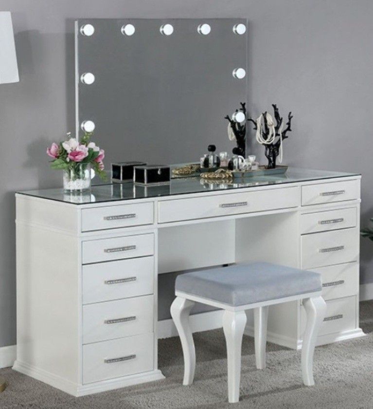 Onlinefurniturebroker.com βπ« We do not have a showroom. We deliver directly from the manufacturer to your home π . π Delivery is only $40 π οΈ Assembly is an extra charge. Price on assembly depends on which item you order! π΅ We accept cash on delivery Mattresses are sold separately π₯We are voted #1 on offer up, please also view other options on our page!!! Beds, bedroom sets, sectional, sofas, daybed, futon, vanity, dining set, chairs, recliner, Loveseat, dresser, queen bed, king bed, desk, kitchen cabinets, shaker cabinet, white Vanity FOA-DK5682WH-PK A series of glitzy bulbs line the large full-bleed mirror, and a glass tabletop adds to the luxurious appeal. Top it off with a padded stool with curved, Queen Anne-style legs and you have a piece fit for a Hollywood-inspired setting. Glam Luminous White Mirror, Solid Wood, Wood Veneer, Others Storage Drawers 4mm Central Mirror 8mm Clear Tempered Glass Padded Stool Included Vanity Set. 59 7/8"L X 20"W X 59"H