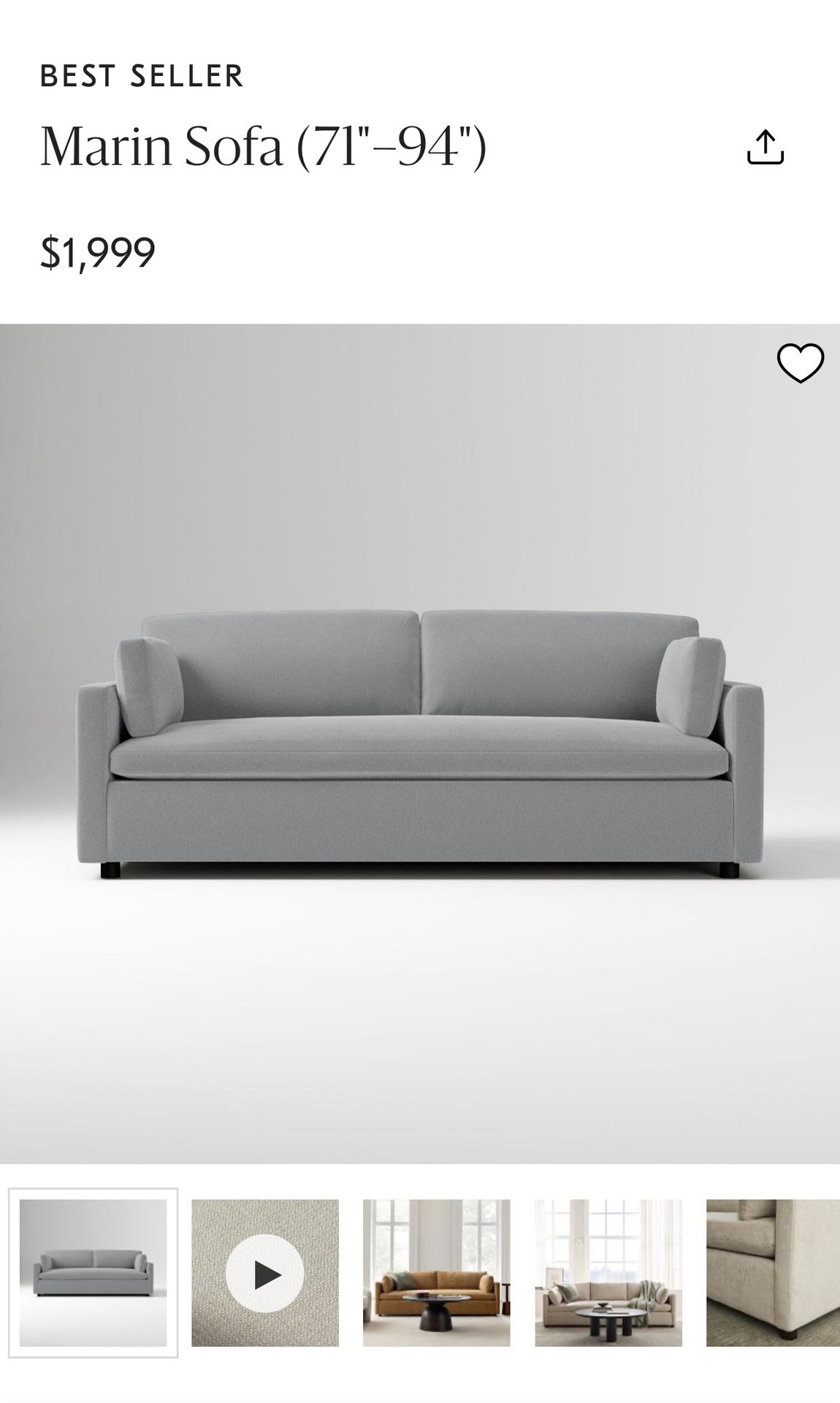Hello! I’m selling my West Elm Marin grey 86” couch. It is Pick up only. No delivery. If interested , ask for my location for pick up. It comes from a pet and smoke free home. I am selling due to bills needing to be paid. It’s in great condition. The covers and pillow covers are removable and washable. Send me a message on here for a better response. Originally $2k. (Click on picture to see original pricing) I’m asking $450, although willing to negotiate on price to an extent. No low ball offers though please. TIA