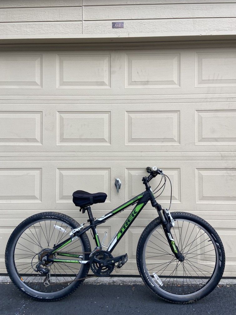 The Trek 3500 is a lightweight aluminum hardtail mountain bike designed for both trails and everyday riding. With its SR Suntour front suspension and Shimano 21-speed drivetrain, it offers smooth shifting, reliable handling, and comfort on mixed terrain.(40) 🔧 Specifications: • Frame: 13” (33cm) aluminum – lightweight and durable • Wheels: 26” Bontrager tires – quick release for convenience • Drivetrain: Shimano 3x7 (21-speed) – wide range for hills and flats • Fork: SR Suntour suspension – absorbs bumps for better control • Brakes: V-brakes – simple and effective • Extras: Bottle holder included ✅ Condition: • Great riding condition • Shifts and brakes work smoothly • Shows light wear consistent with normal use 📏 Rider Height: best for riders 4’11” – 5’4” (150 – 158 cm) A solid entry-level mountain bike that’s reliable, easy to maintain, and perfect for commuting, fitness, or trail fun.