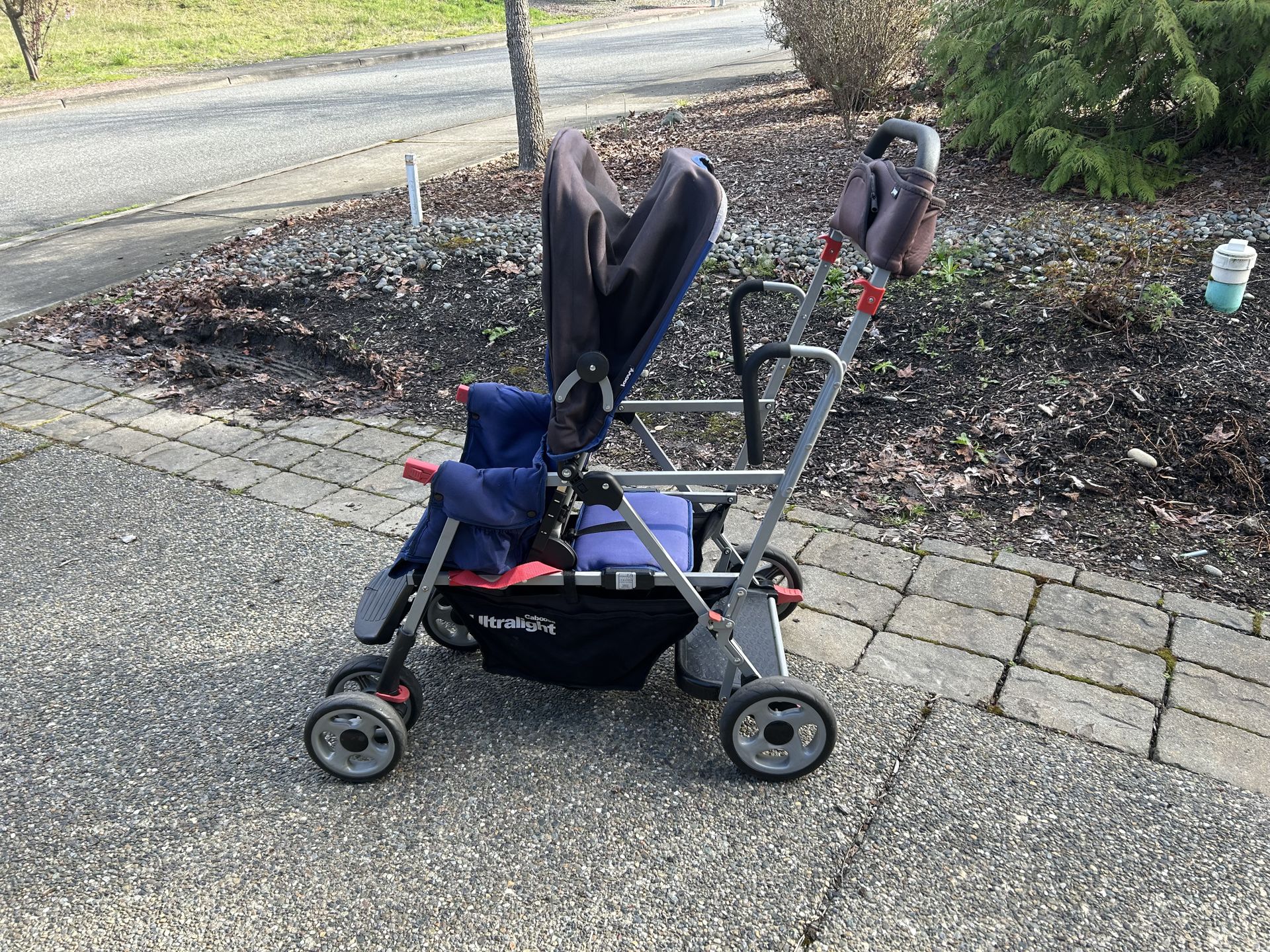 Joovy Caboose 1 front seat with buckles & reclining option 1 back seat that has the option of sitting or standing. Small crack on the front foot rest. $40