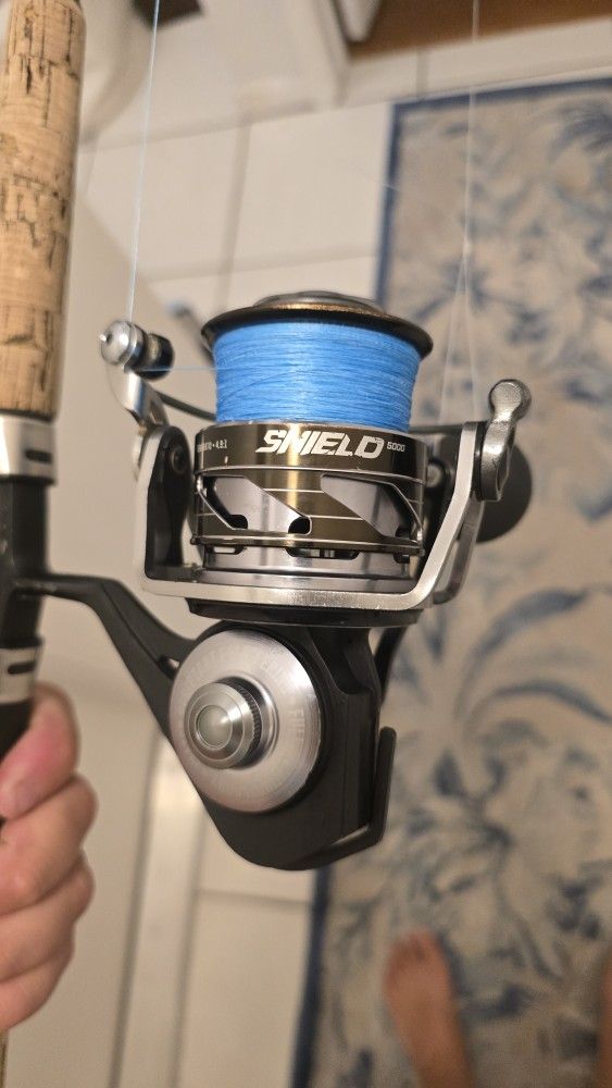 Tsunami shield 5000 on star rod Great reel, some cosmetic wear, spooled with 30lb Rod has the clear coat peeling but all guilds are in good shape Fish Fishing Reel Rod
