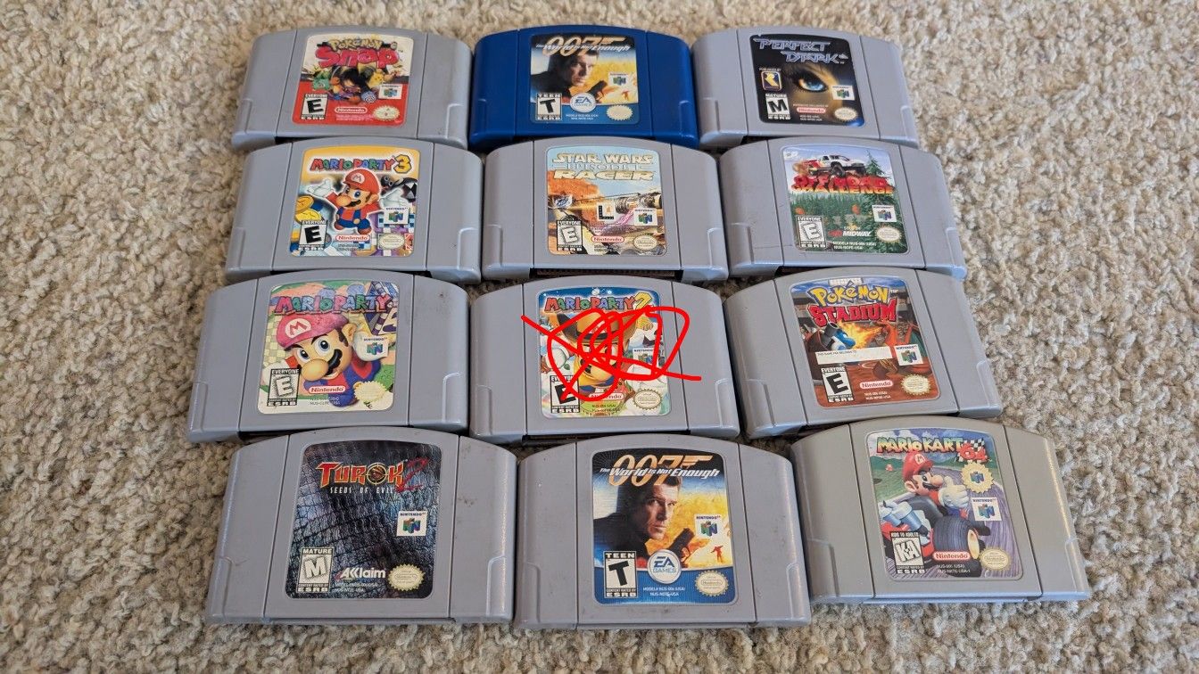 Price is next to the game title Pick up in orange Firm Pokemon snap 20 Worlds not enough 20 blue cartridge Perfect dark 20 Mario party 3 50 Mario party 40 Off road challenge 15 Mario kart 45 Turok 2 10 Worlds not enough 15 grey cartridge Pokemon stadium 30