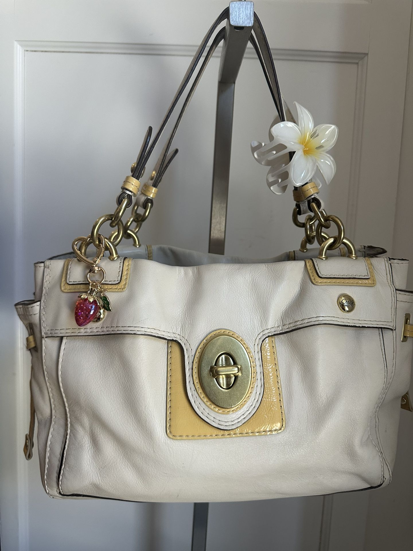 Coach Leather Turnlock Shoulder Bag Cream Yellow Trim Satchel Tote