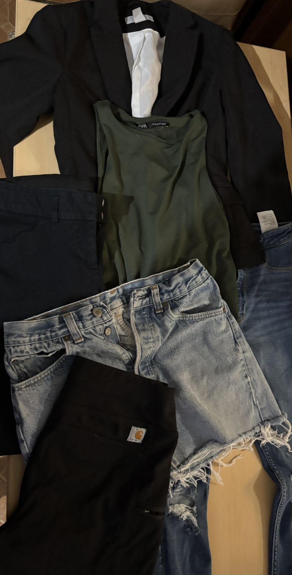 HNM size 4 suit jacket, Zara green bodysuit, Levi jean skirt, Carhartt, black pants, size 4, candies, pants, black, Hollister jeans, size 1. All for 30$
