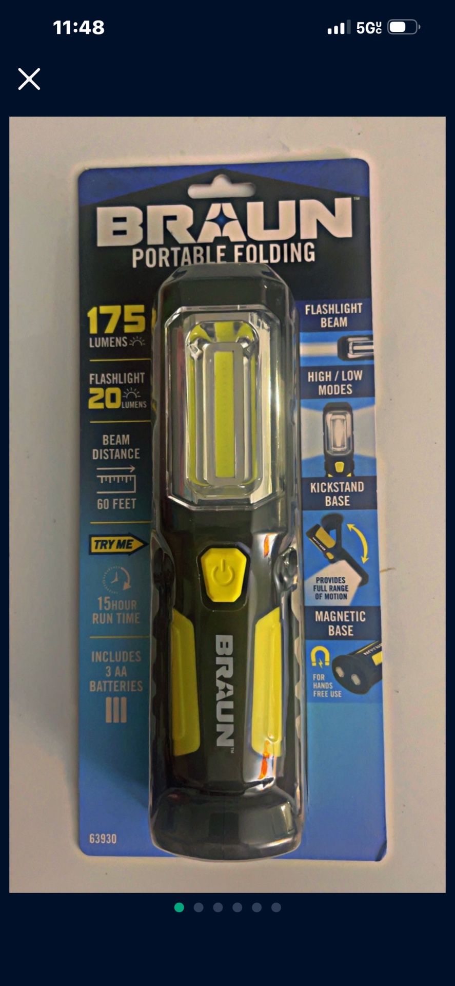 BRAUN PORTABLE FOLDING BRIGHT FLISH This could come in handy during a thunderstorm, power outages or even when working on vehicles or on things this will make a really good gift for anyone. Got 4 left