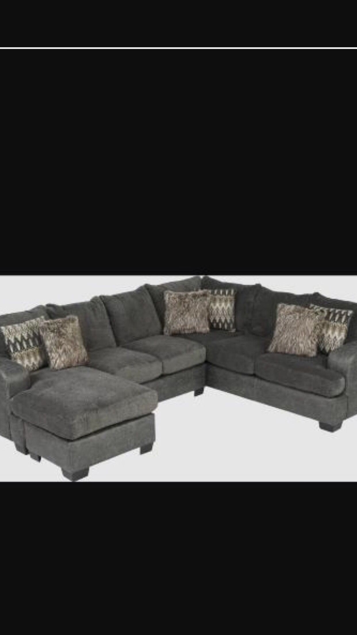 2 piece Gray Sectional sofa . Texture fabric. Reversible Seat. 127”w 100”d 41”h Gray Swivel Chair55”w 55”d 30”h