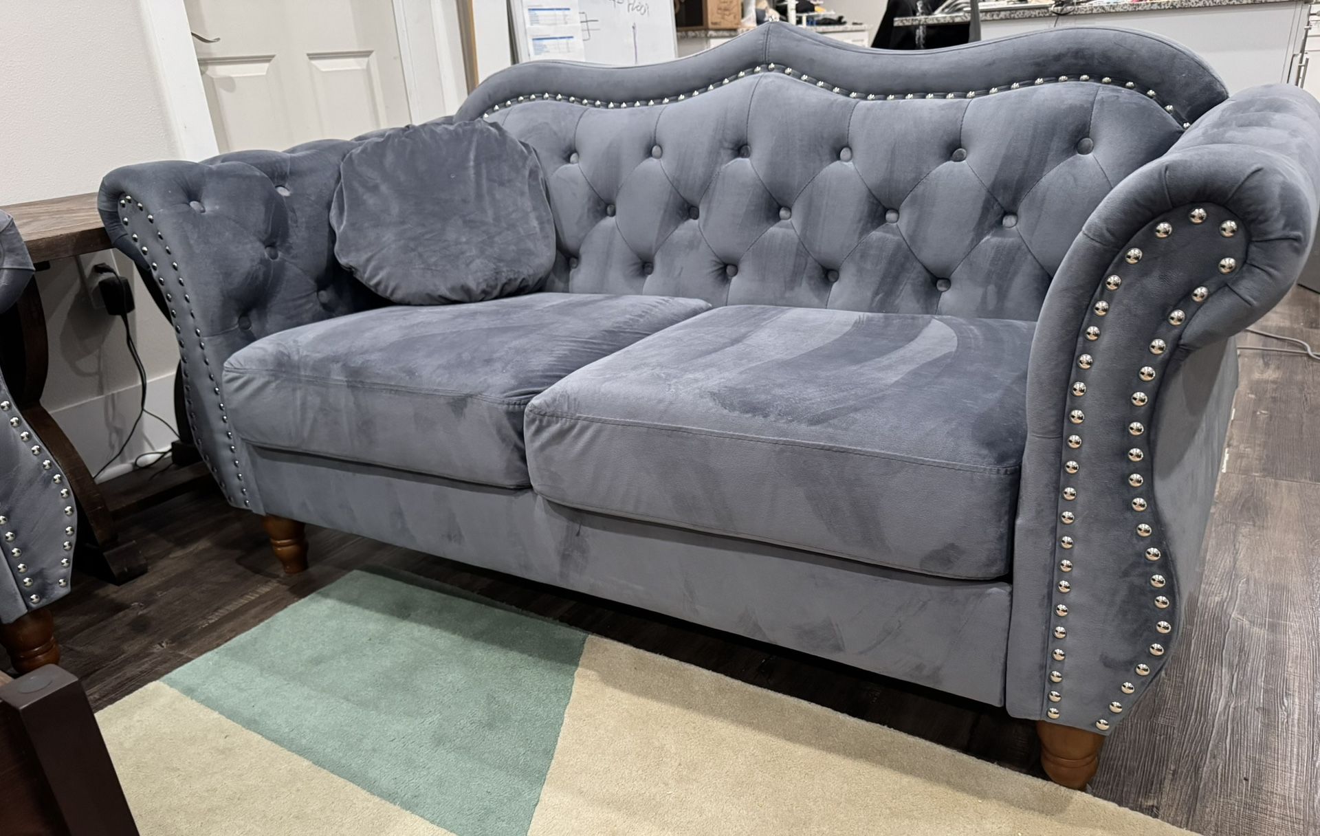 Beautiful gray velvet Chesterfield-style living room set! • 3-seater sofa with deep tufting, nailhead trim, rolled arms, plush cushions & pillows • Matching 2-seater loveseat • Dark wood coffee table with storage shelves & chevron top Elegant, comfortable, and stylish—perfect for modern or traditional decor. Good condition, no major issues. Full set $500 -OBO. Pickup only in Seattle. No holds without deposit. DM for more pics or questions! Cash preferred Brand new is $1200 plus tax!!! Love seat is 32 tall 32 deep 64 wide Davenport is 32 tall 32 deep 80 wide Coffee table is 19 tall 19 deep 41 wide End table small is 24 tall 24 x 12 End table large is 24 tall 24 x 24