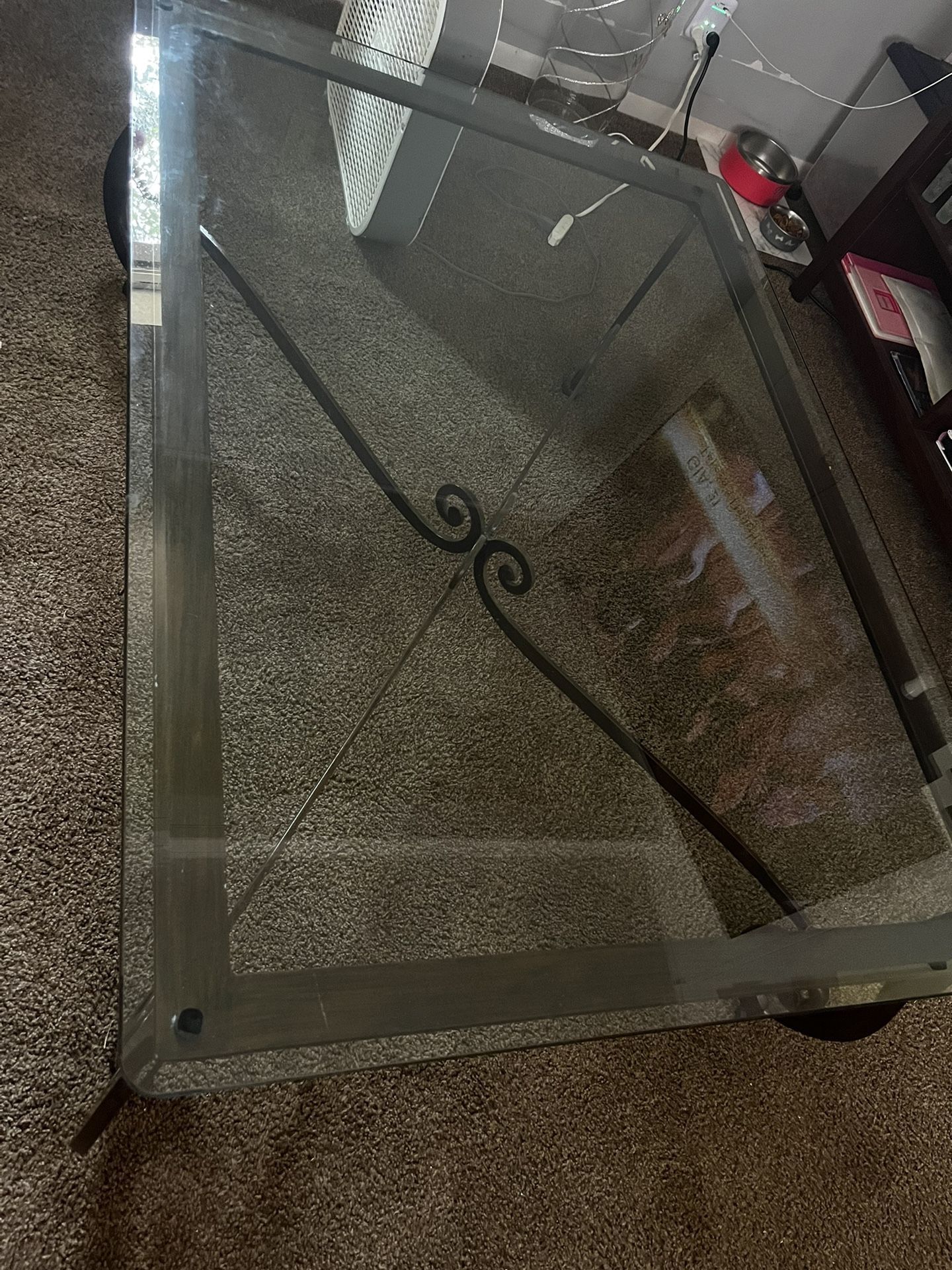 Glass top coffee table. Don’t know exact measurements but it’s about 3ftx4ft-ish. Metal framing of the table is super heavy. This is a $1,000 table that I am getting rid of so I am firm on the price for the wear and tear of an everyday used table. There is a couple chips in the metal base which explains why I’m selling it for a cheaper price. Cash only.