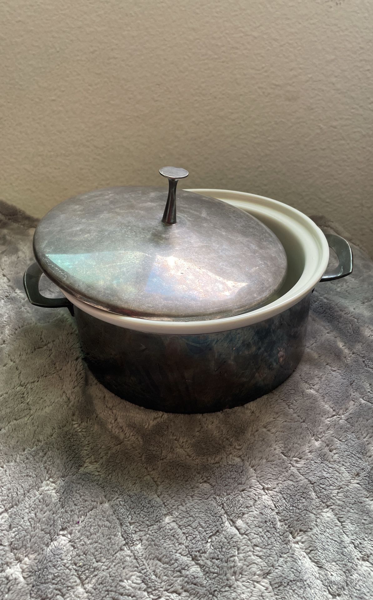 The item presented is a Reed & Barton silverplate covered casserole dish with a Hall Pottery insert. Key details include: It requires polishing of the silverplate and cleaning of the pottery insert. There are no chips, cracks, or dings present. The casserole dish measures 8 1/4 inches across, excluding the handles.