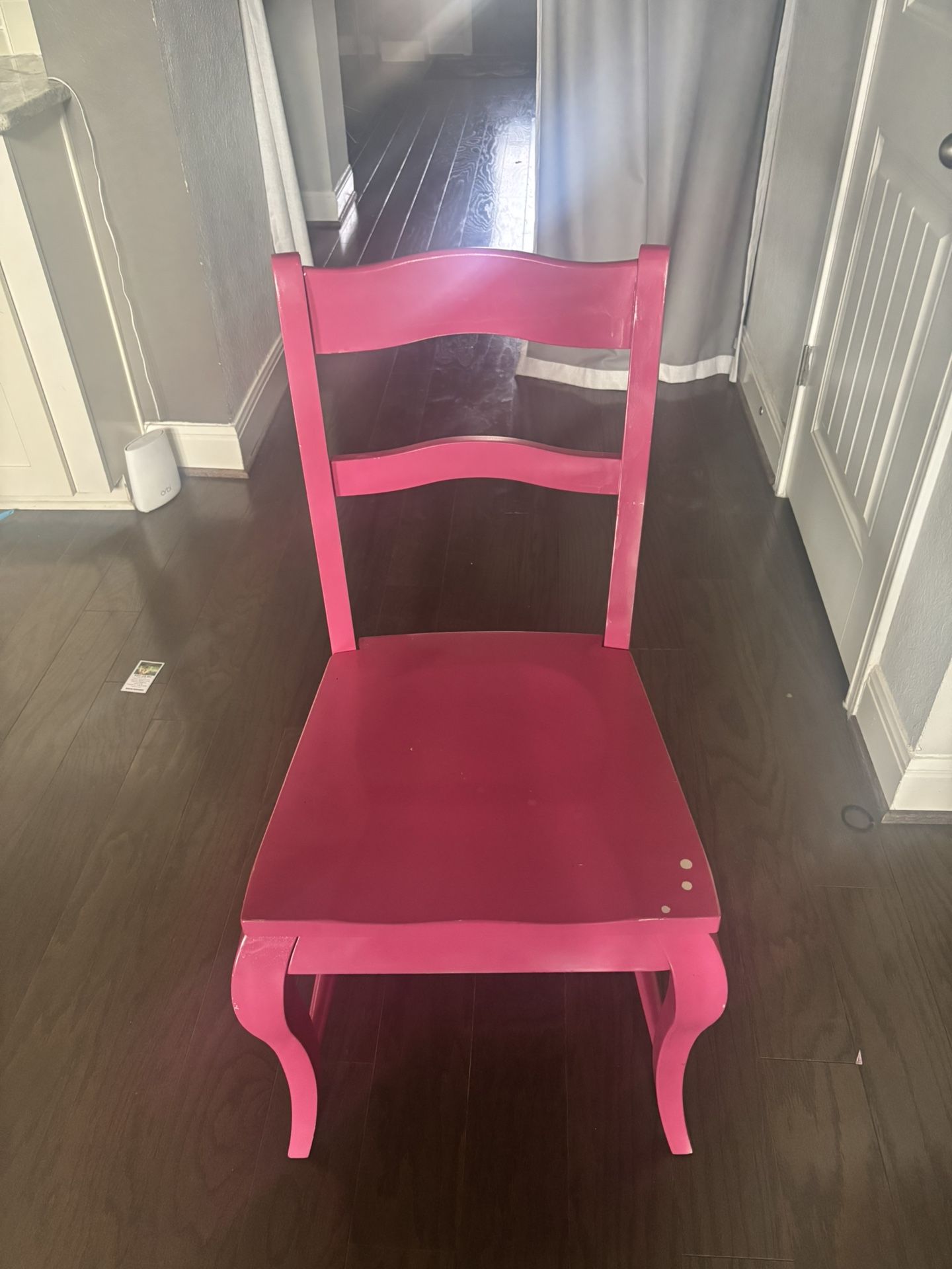Bright hot pink chair . Perfect for kids’ room or as a fun accent piece. Sturdy construction with some wear from use. From smoke-free and pet-free home. Local pickup only.