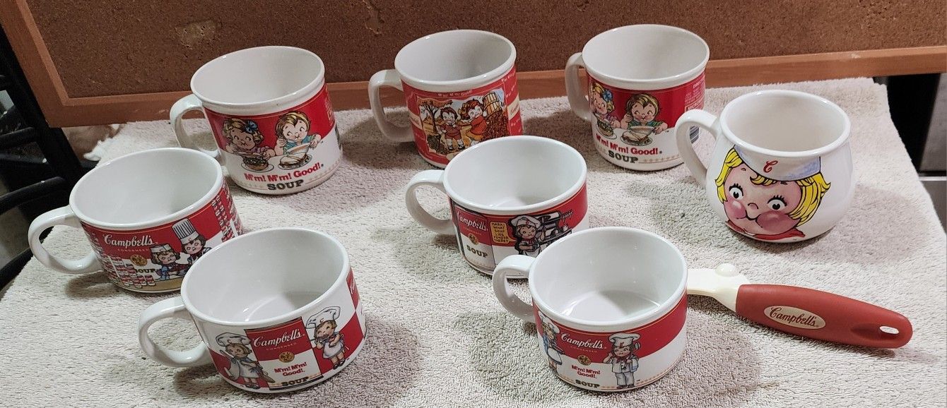 Brand: Campbell's Soup 8 Ceramic Mugs Mugs 1 - 4 from 1997 4 different Mugs, each are 1 cup or 8 ounces each by Westwood Mugs 5 - 6 from 1989 both Mugs are the same image, each are 2 cups or 16 ounces both br Westwood Mug 7 from 1998 different image from others, 1-1/2 cups or 12 ounces from Houston Harvest Mugs 8 from 1998 w Golden hair Child, 2 cups or 16 ounces mug also from Houston Harvest Also included Vintage Campbell's Soup Magnetic Can Opener for Easy Opening Pop-N-Pull Tabs All Mugs are in very good Collectable condition along with opener.