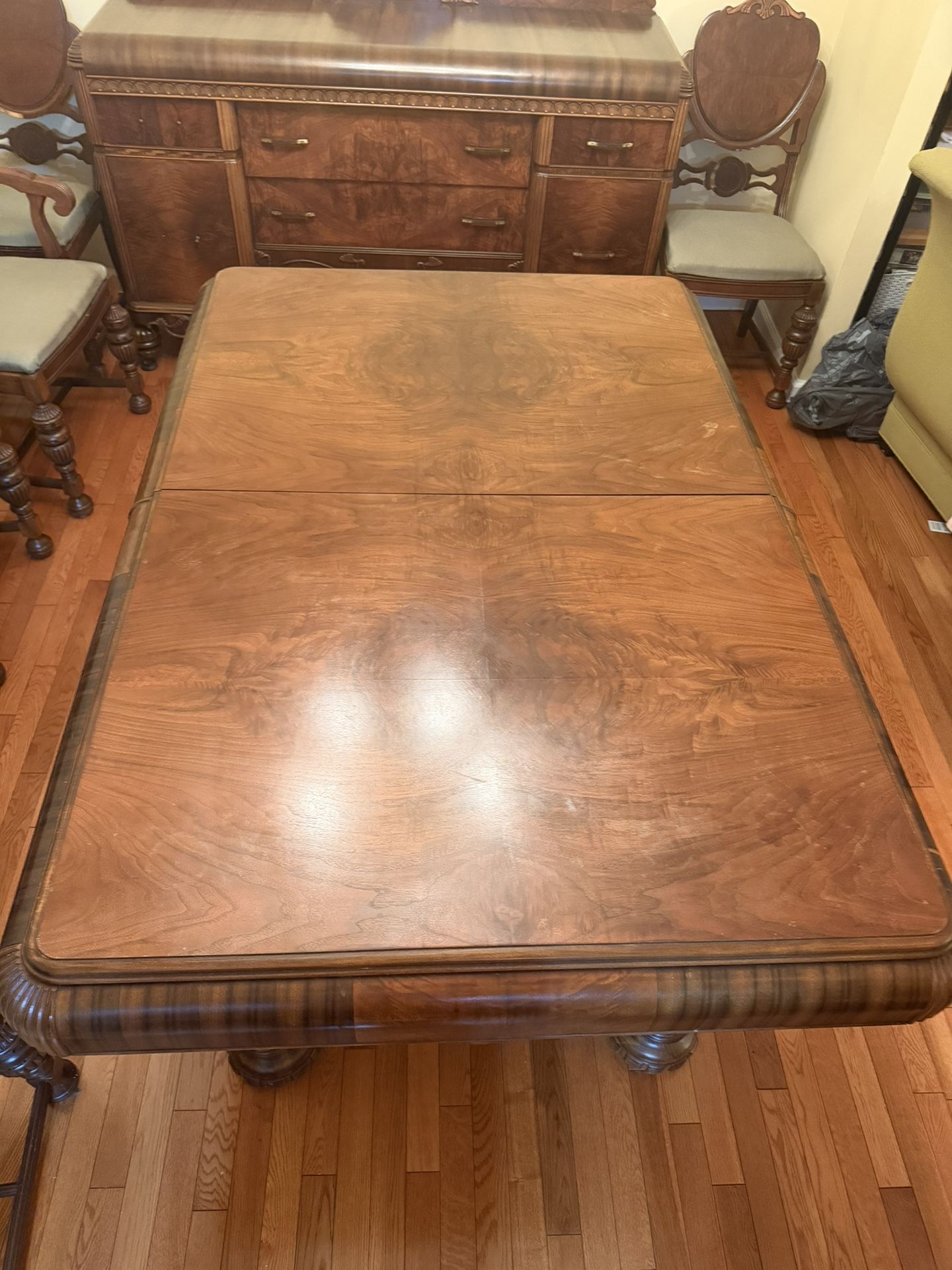 Includes: Dining room table that extends, Six chairs that were refabricated, and a buffet. Notes: some of the chairs are missing some wood as shown in the picture. One of the draws is missing a part as shown in the picture.