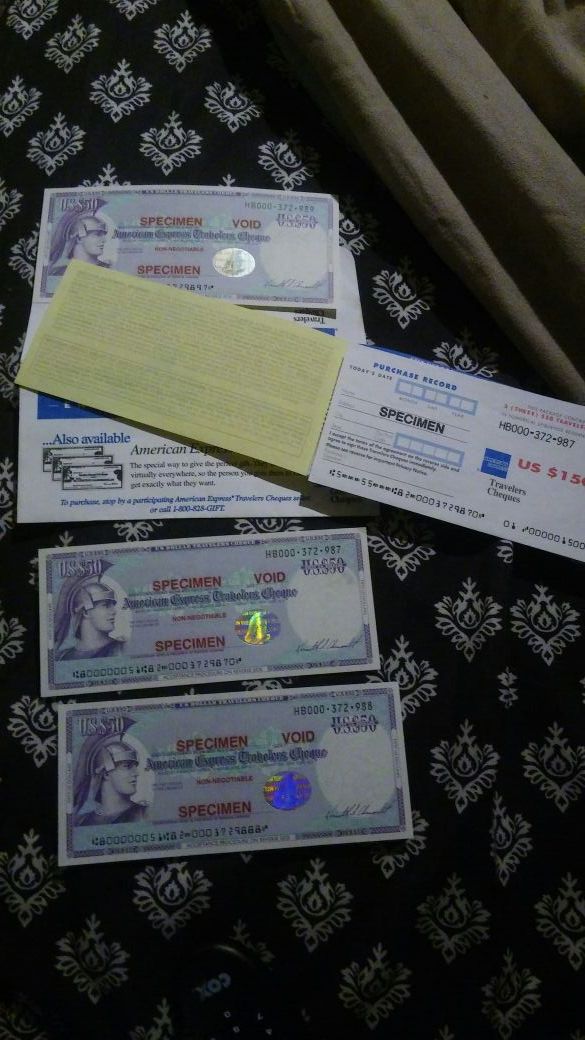 3 uncirculated us $50 American Express Travelers cheque specimens and purchase order specimen matching traveler's check online they're going for $399 a piece I will sell them all for $1,000 don't waste my time with any stupid questions do your research you can call me at (contact info hidden)
