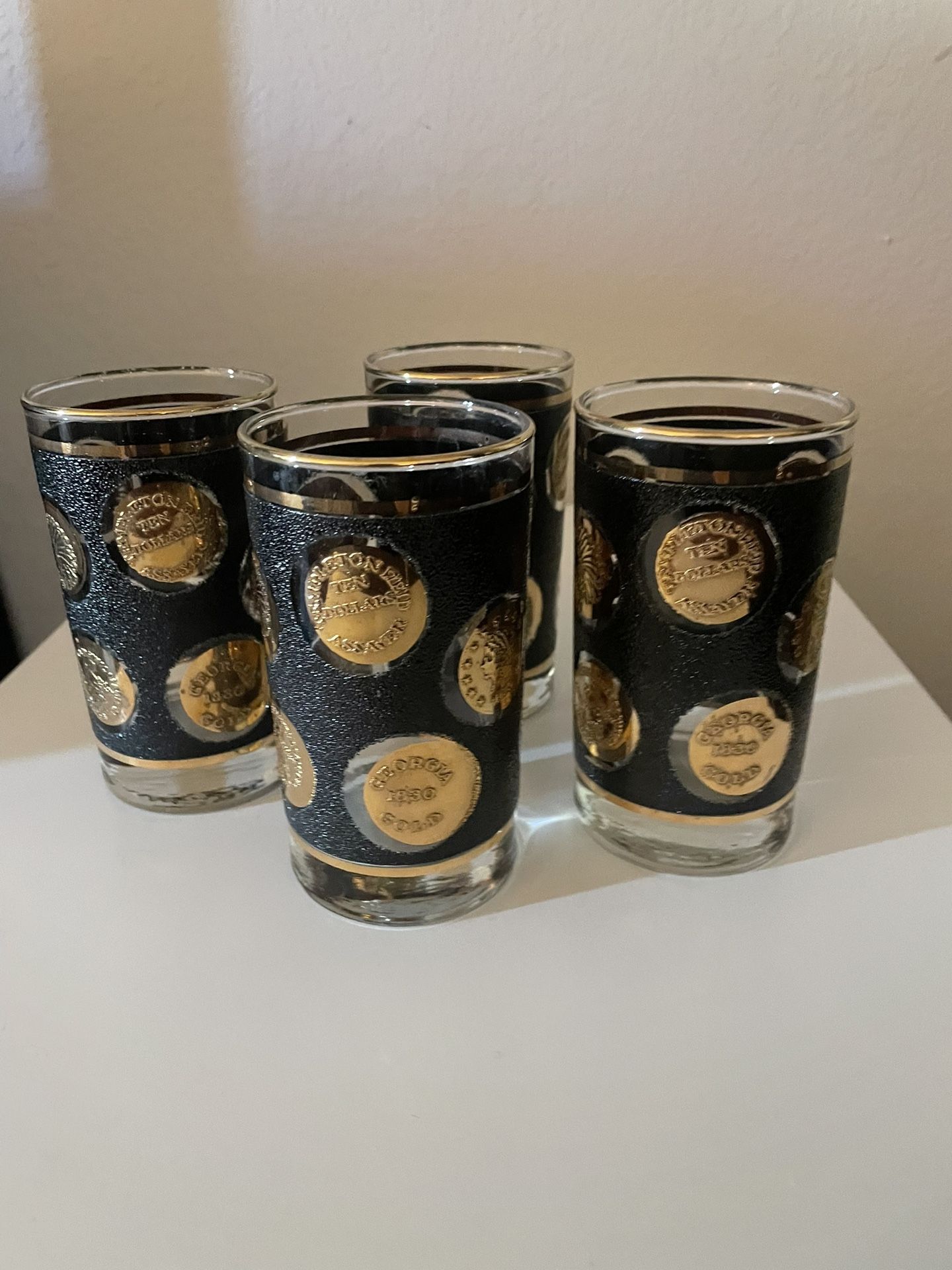MCM Vintage Libbey Mid Century High Ball Glasses Gold Coin Black & Gold Set of 4